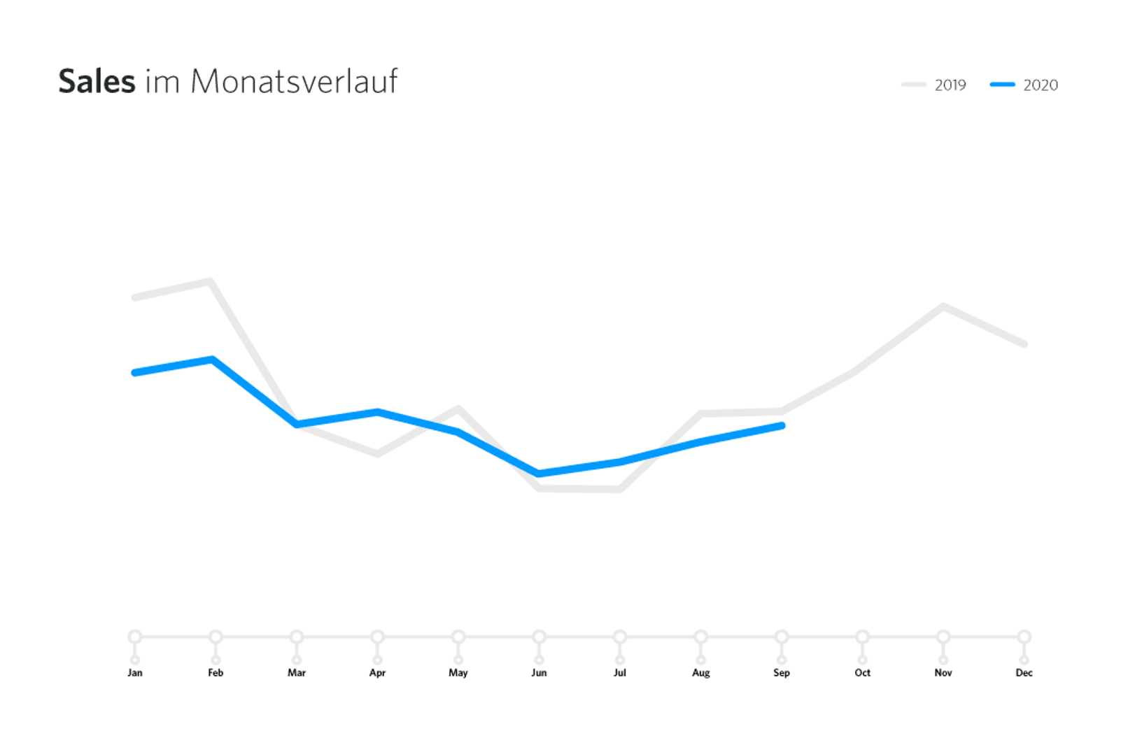 Betrachten wir die Daten im Jahresverlauf 2019, so sehen wir, dass mit dem Ende der Wintermonate die Sales ab März 2019 deutlich zurückgingen und erst ab September wieder anstiegen, sodass während der Frühlings- und Sommermonate ein charakteristischer Kessel entstand. Dieses Verbraucherverhalten ist auch nur logisch: Denn entweder beschäftigen sich Verbraucher zu Beginn des Jahres mit neuen Tarifen, weil sie zum Jahresbeginn Kosten einsparen möchten, oder sie suchen im letzten Quartal des Jahres – wenn die Tage wieder kälter werden – nach besseren und günstigeren Tarifen.