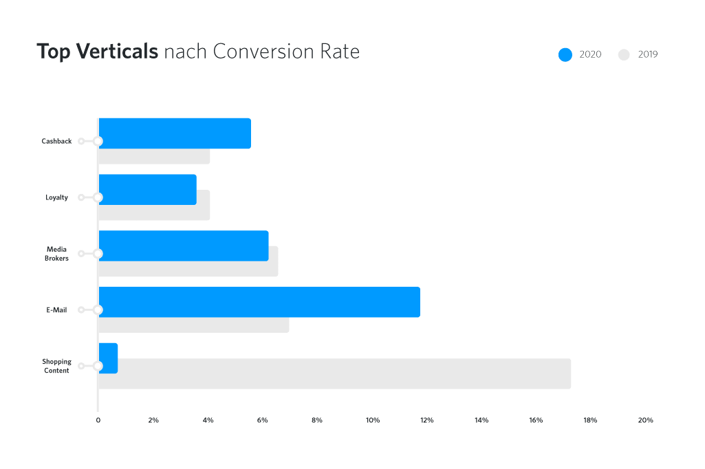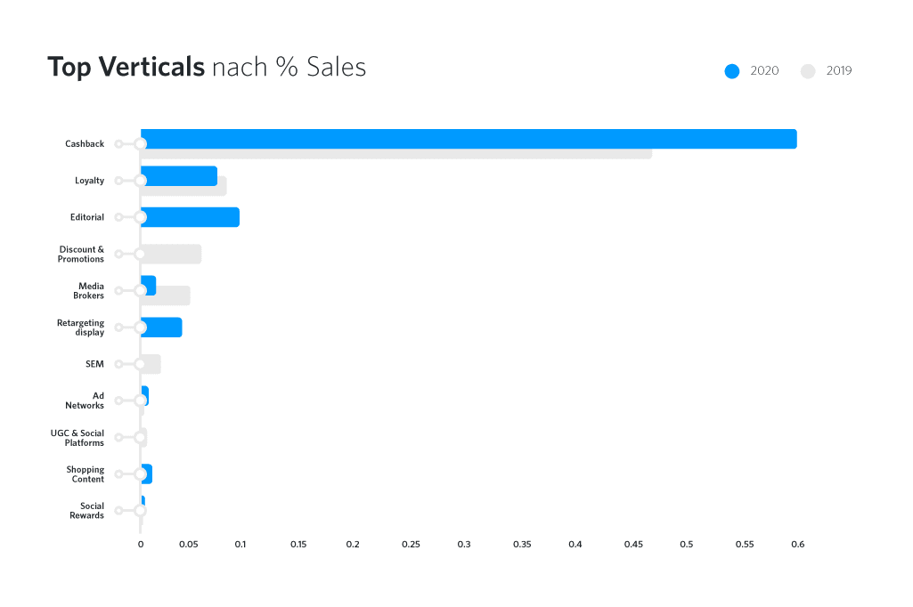 Sub Networks haben dagegen ganze 7,2 Prozent weniger Sales generiert als noch 2019. Auch die Verticals Loyalty (-1,9 Prozent) und Gutschein-Seiten (-2,5 Prozent) haben weniger Sales verzeichnen können als noch im Vorjahr.