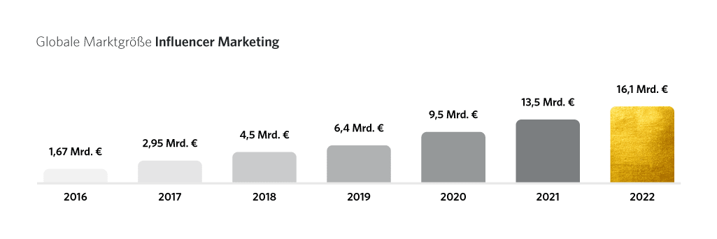 Influencer Marketing ist in den letzten zehn Jahren enorm gewachsen und wird in diesem Jahr schätzungsweise 16,1 Mrd. Euro wert sein. Die Branche wurde durch die zunehmende Nutzung von mobilen Endgeräten, Social Media Apps sowie durch die hohe Nachfrage an authentischen und unterhaltsamen Inhalten stark angekurbelt.