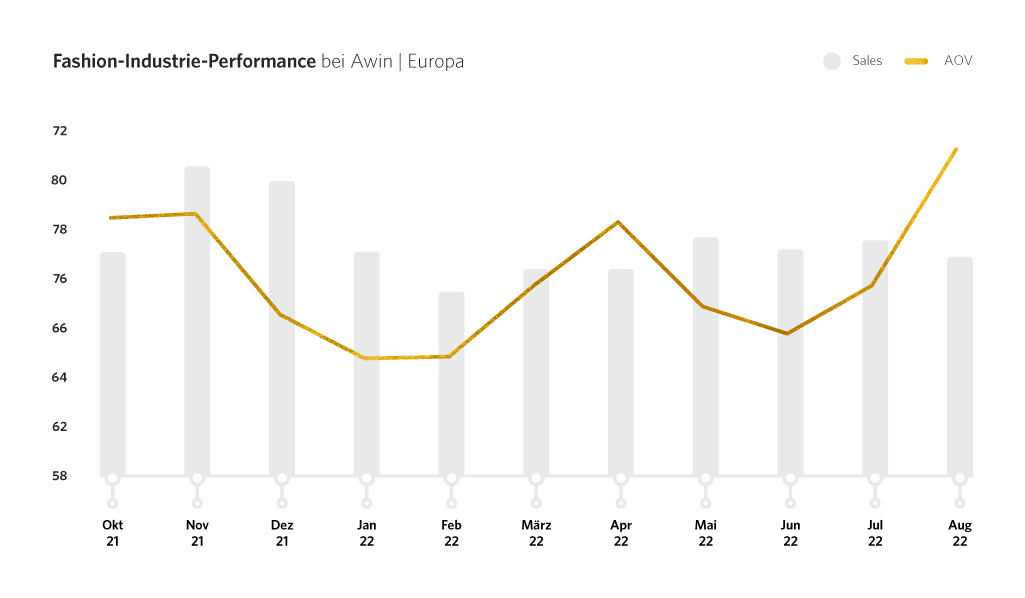 Die Fashion-Industrie bietet hier ein interessantes Beispiel, denn wie in der unten stehenden Grafik zu erkennen ist, sind die Sales zusammen mit dem Aufkommen der Inflation über das Jahr 2022 hinweg stetig zurückgegangen - mit einem durchschnittlichen vierteljährlichen Rückgang von -4% von Q2 auf Q3. Der AOV wächst jedoch weiterhin mit einem durchschnittlichen vierteljährlichen Anstieg von 17%, weshalb wir für den Rest des Jahres weiteres Wachstum in der Fashion-Industrie prognostizieren.