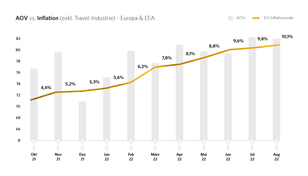 Auf den ersten Blick erscheint das widersprüchlich. Angesichts des derzeitigen wirtschaftlichen Drucks erwarten wir, dass das Sales-Volumen im Allgemeinen in diesem Goldenen Quartal sinken wird. Das Gleiche könnte man auch für den durchschnittlichen Bestellwert (AOV) erwarten. Allerdings gehen wir davon aus, dass gerade wegen des Inflationswachstums der AOV im vierten Quartal steigen wird.