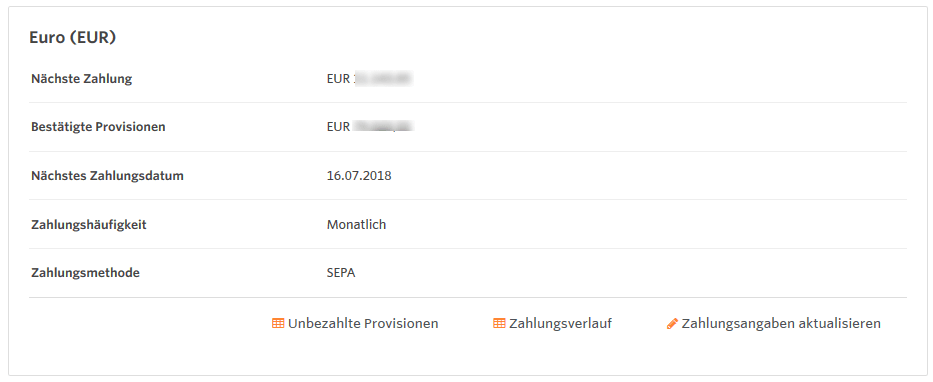 An dieser Stelle können Publisher ebenso die einzelnen bestätigten Transaktionen (bestätigte Provisionen mit ausstehender Zahlung vom Advertiser) sowie den Zahlungsverlauf einsehen, der einen Überblick über die vorherigen Auszahlungen liefert. Zahlungsangaben können hier auch direkt aktualisiert werden.