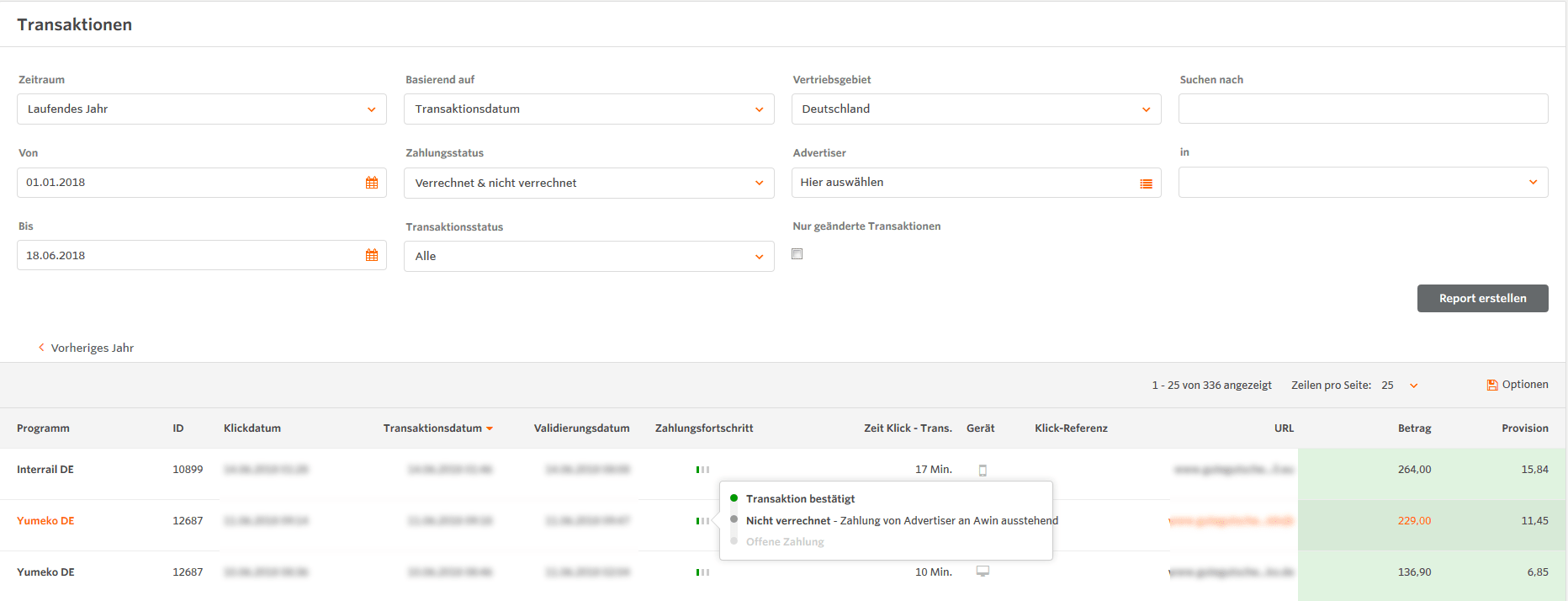 Wenn Du also auf “Unbezahlte Provisionen” klickst, findest Du Details zu jeder Transaktion. Hier kannst Du verschiedene Filter nutzen oder die Spalten nach Belieben sortieren. Folgende Informationen stehen pro Transaktion zur Verfügung:
