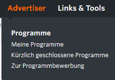 Der Zahlungsstatus jedes Advertisers ist in dem Advertiser-Verzeichnis einsehbar. Wähle in dem Reiter „Advertiser“ entweder „Meine Programme“ für Advertiser, mit denen Du bereits zusammenarbeitest. In dem Menüpunkt „Kürzlich geschlossene Programme“ findest Du einen Überblick über Programme, die vor Kurzem geschlossen wurden. Neue Advertiser findest Du unter „Zur Programmbewerbung“.