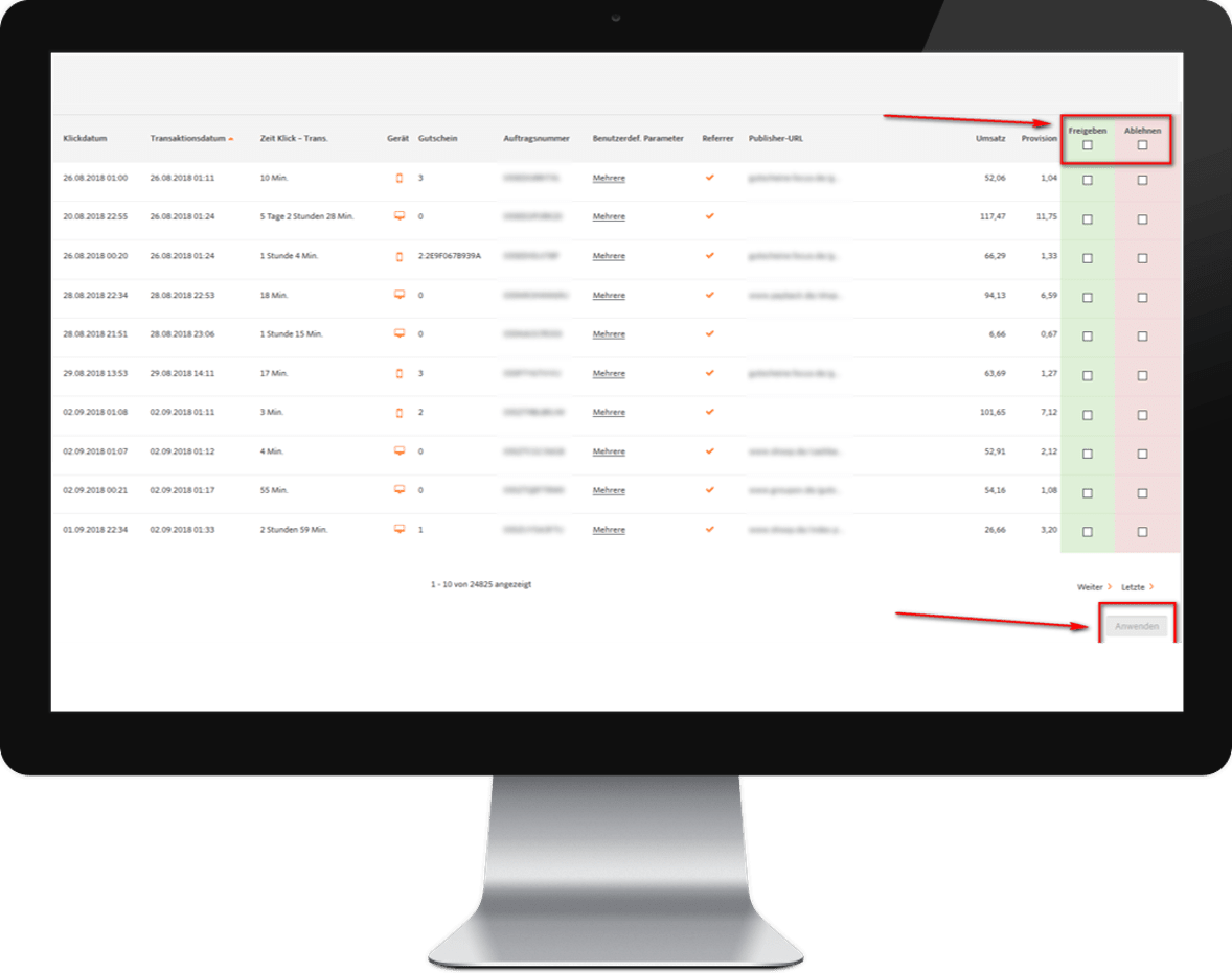 Die Sales Validierung ist elementarer Bestandteil des Affiliate Marketings und eines jeden Partnerprogramms, da es hierbei um die Vergütung Deiner Publisher geht. Deine PartnerInnen vertrauen darauf, dass sie von Dir für ihre erbrachten Leistungen korrekt vergütet werden, weshalb es in Deiner Verantwortung liegt, eingegangene Transaktionen genau zu prüfen. Dies kann beispielsweise mithilfe Deines Warenwirtschaftssystems geschehen. Wenn eine Transaktion vollständig abgeschlossen, also vom Endkunden bezahlt und nicht retourniert oder storniert wurde, muss diese freigegeben werden, damit der Publisher seine Provision erhält. Es gibt jedoch auch Fälle, bei denen Anpassungen an einzelnen Transaktionen vorgenommen werden können. Dies ist zum Beispiel der Fall, wenn von fünf bestellten Produkten zwei zurückgeschickt wurden. Hier kann dann einfach der Warenkorb angepasst werden. Außerdem besteht die Möglichkeit, Transaktionen abzulehnen, wenn die Bestellung komplett storniert, retourniert oder nicht bezahlt wurde.