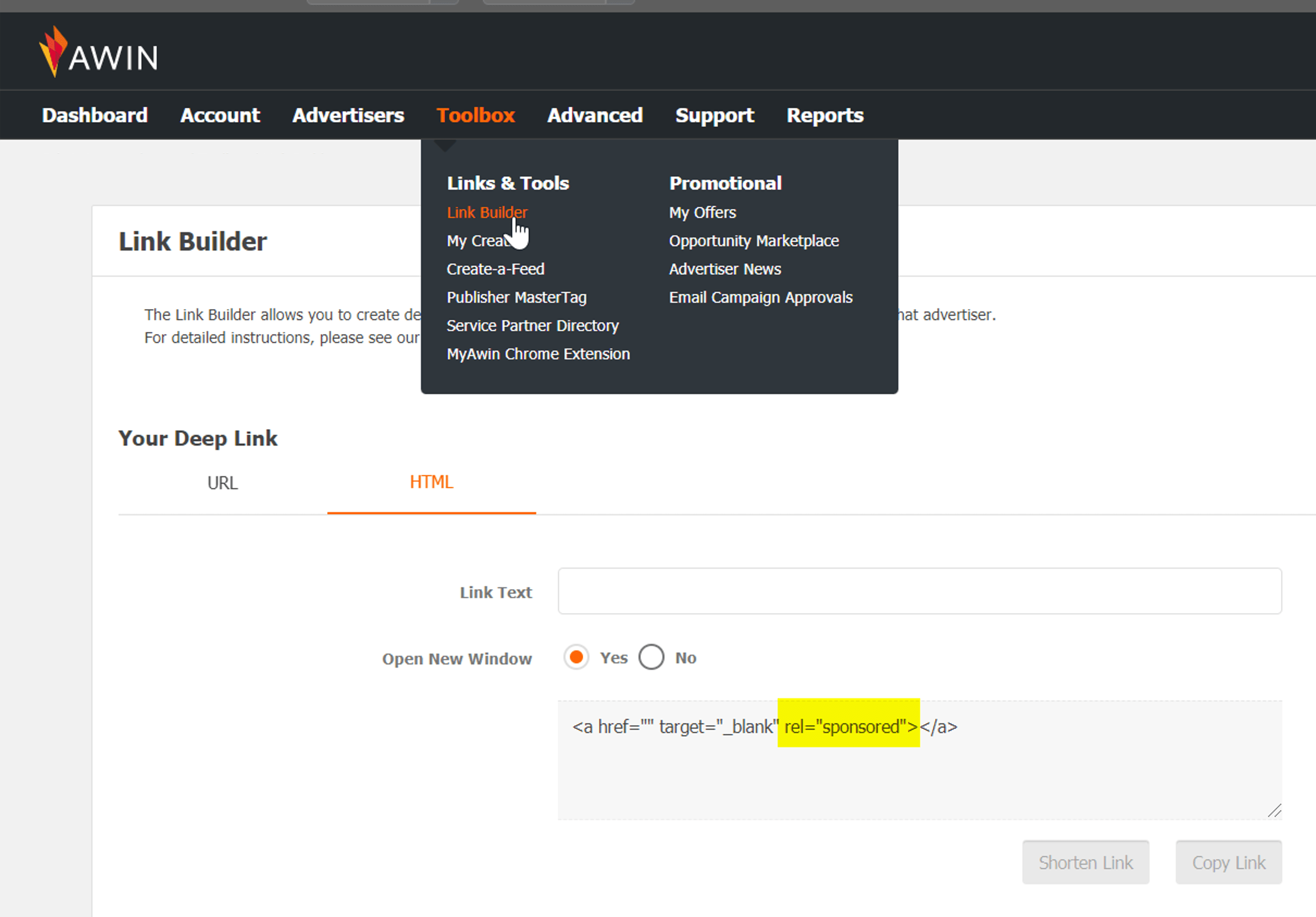 Hoe je met tools van Awin de waarde "sponsored" toevoegt aan affiliate links