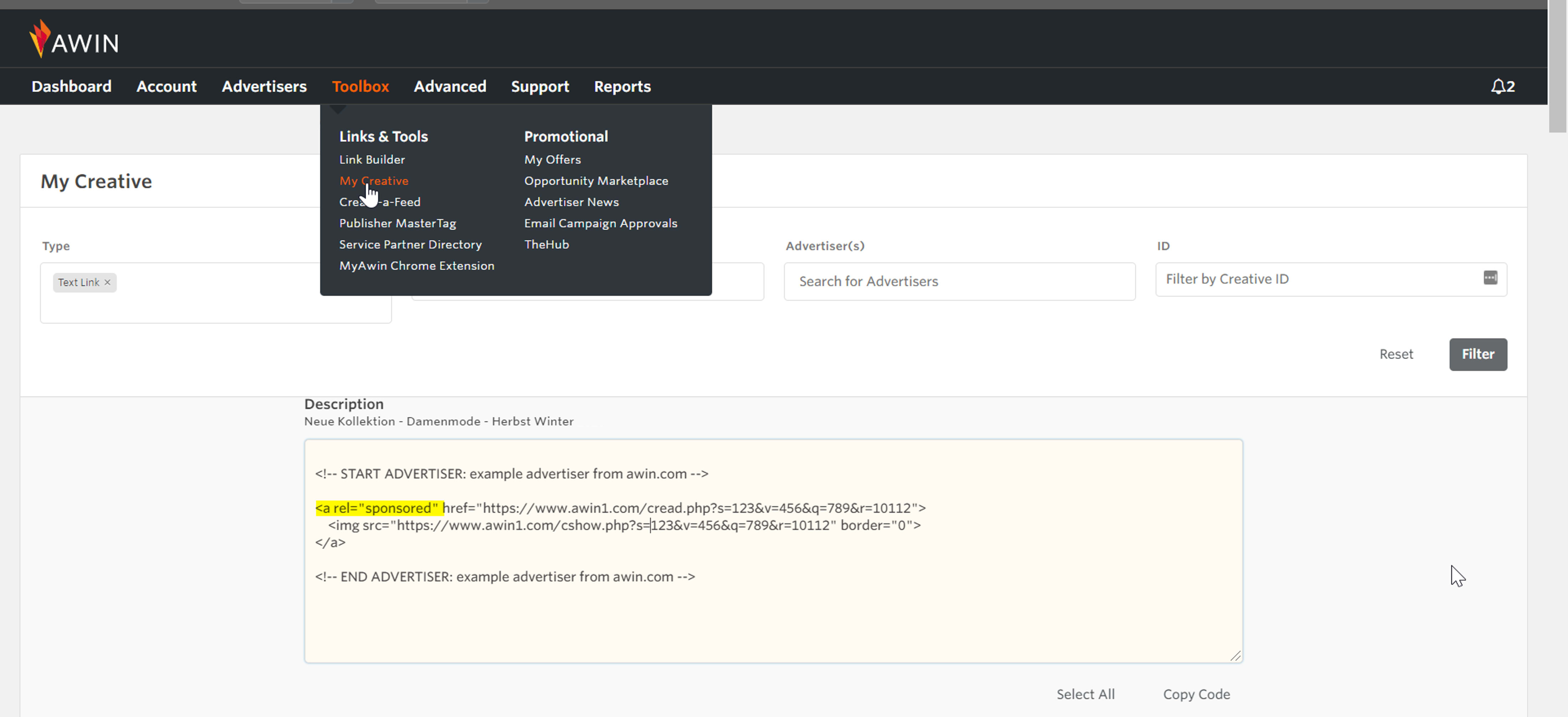 Net als in Link Builder wordt het attribuut rel="sponsored" automatisch aan je links en HTML-code toegevoegd. Je kunt de code met eenvoudig kopiëren en plakken op je website gebruiken.