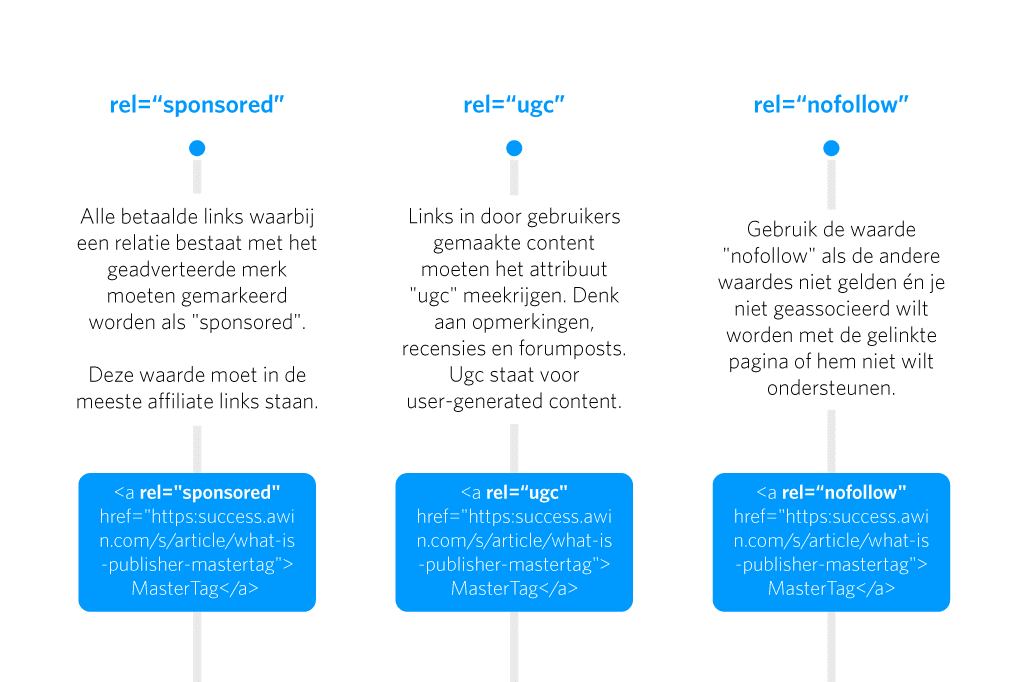 Hier komen link attributes om de hoek kijken. Deze code geeft Google meer inzicht in het beoordelen van links. Google adviseert het gebruik van rel=attributes. Daarbij wijzen ze op strengere maatregelen om de ranking van je pagina’s te verlagen, als je de juiste link attributes niet toevoegt.