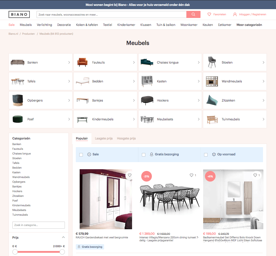 Doordat Biano een full focus heeft op het bedienen van de consument die op zoek is naar producten binnen de home & living branche, is het productoverzicht dan ook het belangrijkste onderdeel van het platform. Door ons platform op alle devices zo gebruiksvriendelijk mogelijk in te richten, een uitgebreid assortiment aan te bieden en daarnaast te zorgen voor een zo’n optimaal mogelijke product sortering gericht op de consument, zien we dat Biano een belangrijke schakel vormt tussen de aangesloten webshops en de shoppende woonliefhebber.