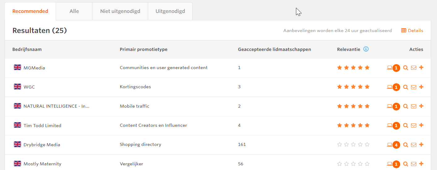 Awin heeft een algoritme gemaakt om je de meest geschikte publishers voor te stellen. Het rapport genereert automatisch tot 25 aanbevolen partners per dag. Ze zijn te vinden op het tabblad “Aanbevelingen” van de Publisher Directory.