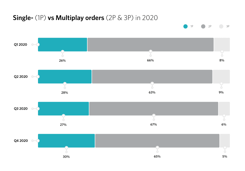 De multiplay-markt (breedband in combinatie met andere diensten als tv en bellen) is in Nederland jaar op jaar nog altijd groeiende. Van de multiplay-diensten daalt de traditionele 3P bundel (breedband, tv en vaste telefonie) echter steeds verder aangezien haast niemand meer geïnteresseerd is in vaste telefonie. Het afgelopen jaar koos (met gemiddeld 67%) het overgrote deel van de consumenten dan ook voor een combinatie van internet en tv (2P). Daarnaast groeit de combinatie van vast-mobiele diensten nog altijd op de multiplay-markt (zie FMC vs NON-FMC).