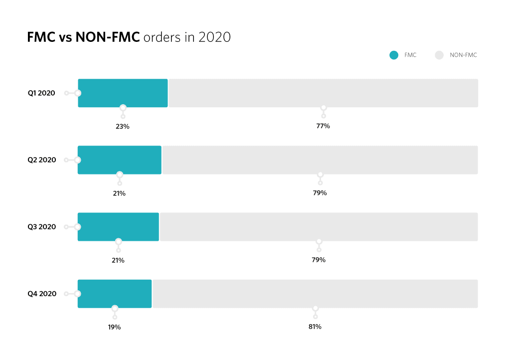 Wanneer we kijken cijfers van het afgelopen jaar dan zien we dat het gemiddelde aandeel FMC licht afgenomen is. Onder de providers die zowel mobiele als vaste diensten aanbieden was het aandeel FMC orders aan het begin van het jaar circa 23%. Dit daalde gedurende het jaar naar 19% in de laatste 3 maanden van het jaar.