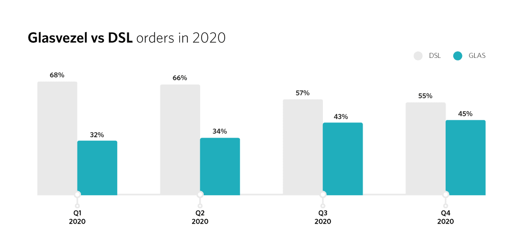 Bij providers die zowel kabel- als glasvezelverbindingen aanbieden bestond in de maanden voor de lockdown gemiddeld 32% van de orders uit glasvezelinternet.