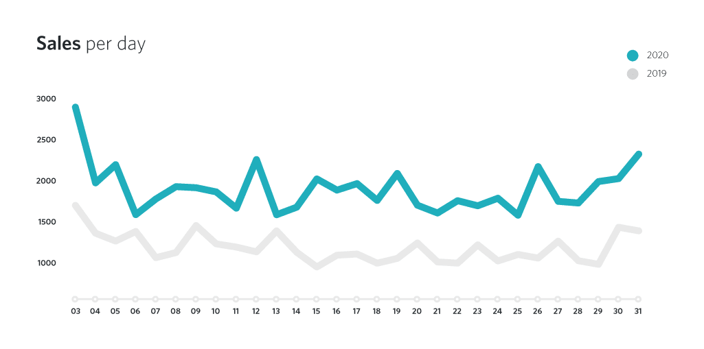 Het jaar 2019 was voor de winter Solden zeer succesvol voor de Awin adverteerders. Met een groei van 63% in sales en 54% in de orderwaarde steeg de omzet flink. Ter vergelijking: volgens Mode Unie heeft de algehele markt het 7% minder gedaan door het warme winterweer. Hieronder zie je de ontwikkeling van de sales jaar op jaar vergeleken. De eerste dag van de Solden is dus de belangrijkste; hier worden in ieder geval dan worden de meeste sales gezet. Dit is waarschijnlijk omdat mensen zeker willen zijn van het product dat op hun verlanglijstje staat. Iets anders dat opvalt is dat in 2019 de laatste dag iets minder deed en in 2020 zagen we juist een stijging op de laatste dag