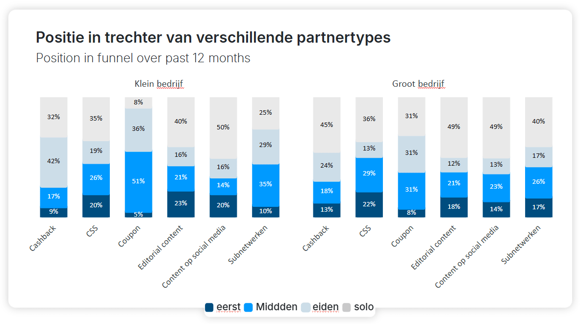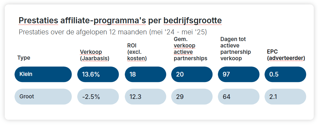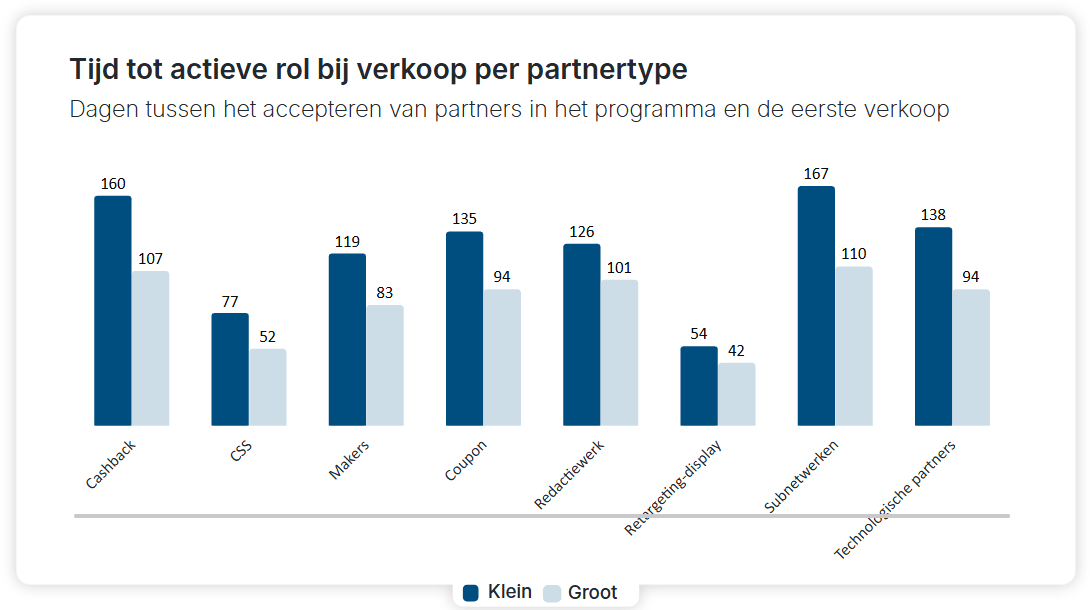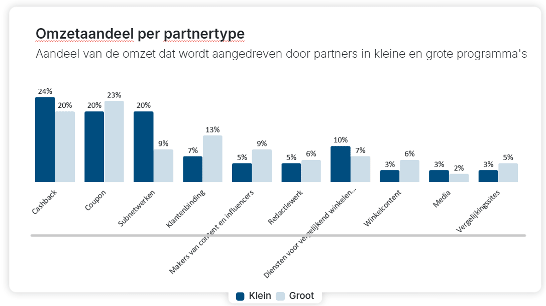 Cashback, kortingspartners en subnetwerken presteren goed in beide cohorten. Ons oog viel echter op de significant lagere omzet voor contentmakers en influencers bij kleine bedrijven in vergelijking met grote bedrijven (5% vs. 9%).