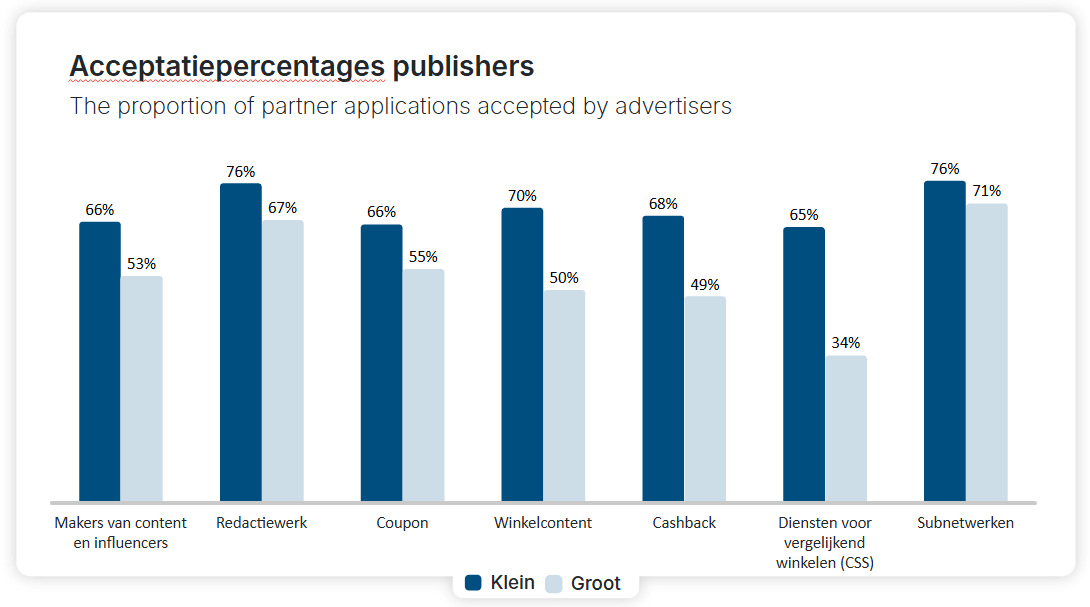 Toen we het gebruik van verschillende partnertypes door kleine bedrijven onder de loep namen, konden we een solide conclusie trekken na het bestuderen van acceptatiepercentages: het percentage publisheraanvragen dat wordt goedgekeurd door adverteerders.