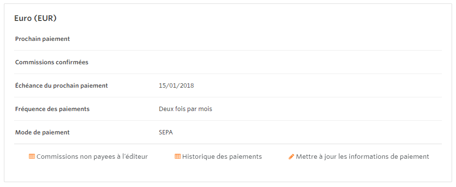 Ce rapport permet également aux éditeurs d’avoir une vue d’ensemble sur leurs commissions non payées (commissions en attente de paiement) et sur leur historique de paiements (résumé de tous les paiements du compte de l’éditeur). Par ailleurs, sur cette même page, il est possible de modifier les informations de paiement, telles que les coordonnées bancaires.