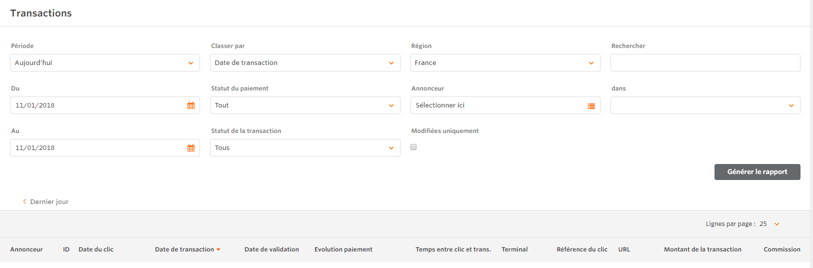 Dans le rapport des transactions, chaque transaction faisant partie du montant total est classée et peut être filtrée par :
