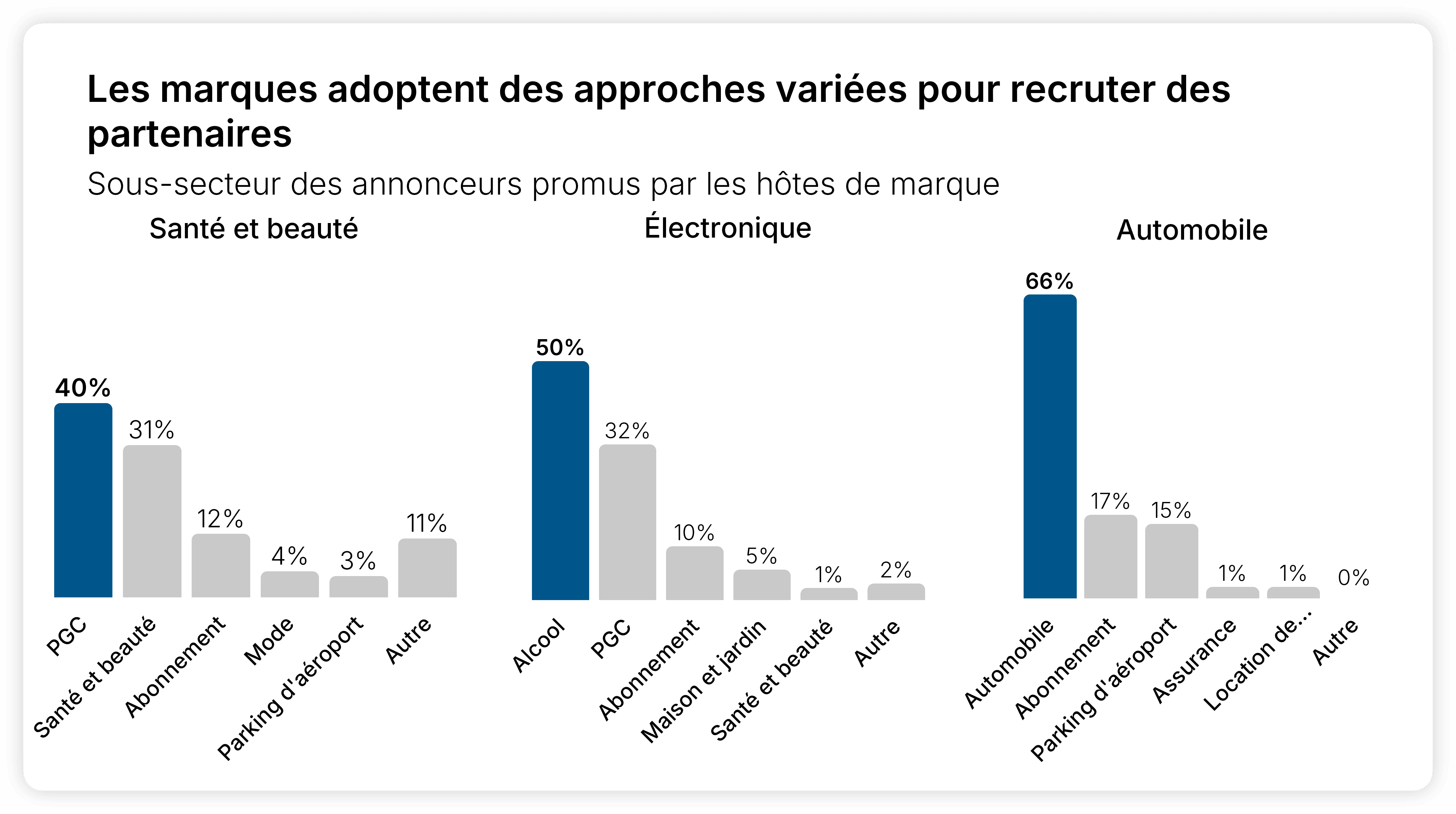 La situation est différente dans des sous-secteurs comme celui de l'électronique, où la variété des produits nécessite une promotion plus équilibrée entre les alcools (50 %), les produits de grande consommation (32 %) et les annonceurs par abonnement (10 %).