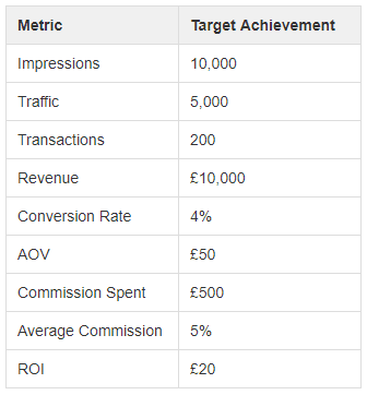 Essas metas não foram calculadas simultaneamente, mas se concentram em uma conquista máxima para cada métrica separadamente. Embora seja importante ter metas individuais, essas métricas estão todas interligadas e, dessa forma, apesar de atingir metas de transação, receita e comissão média, ainda seria possível mostrar uma falha extrema em AOV e gastos excessivos em comissão. 500 transações em uma AOV de £150 significariam uma meta de receita de £75.000 e, com uma comissão média de 5%, significaria um gasto de £3.750.