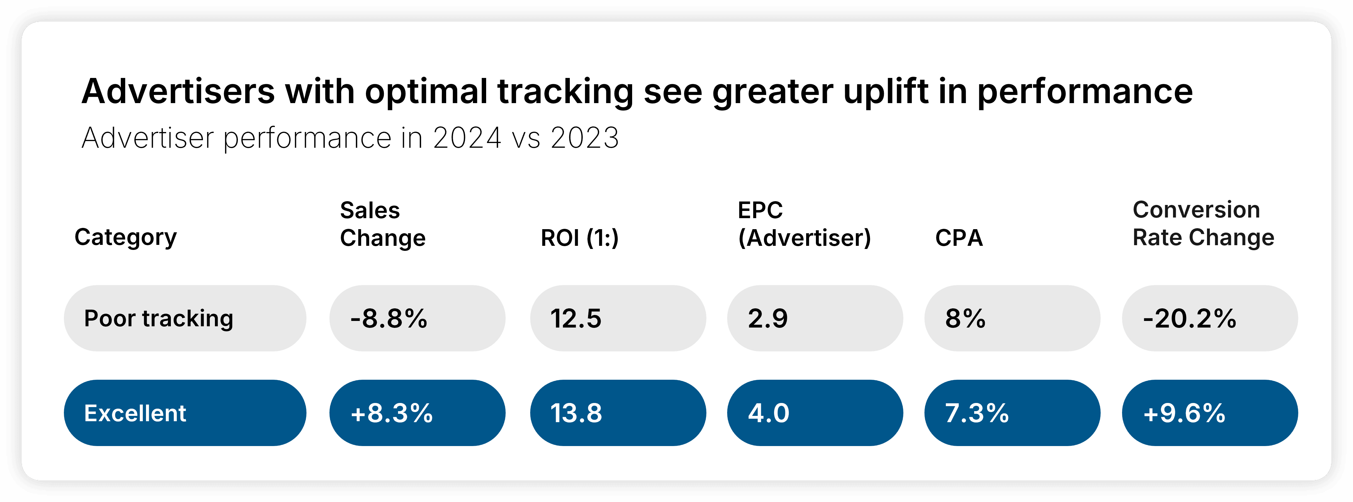 Com rastreamento melhor, você gera dados mais precisos, o que gera conhecimento, ajuda os anunciantes a tomarem decisões que elevam as taxas de vendas e conversão (CVR), com menos custo. Em 2024, constatamos que anunciantes que usavam padrões de alta qualidade, como S2S ou rastreamento por aplicativos, conseguiram CVR 9,6% maior em 2024, enquanto aqueles com configurações ruins tiveram uma redução de CVR de 20,2%.