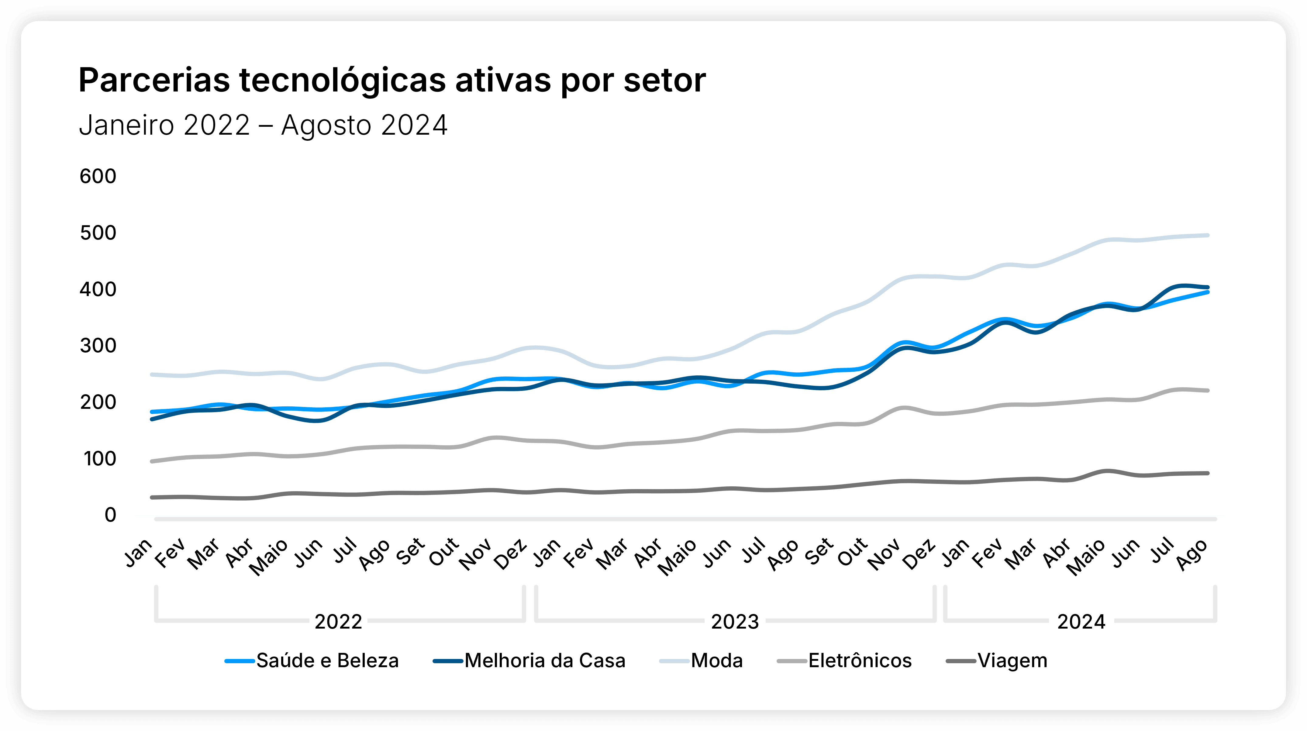 Home Improvement (405) e Health & Beauty (396) também apresentam níveis crescentes de ativações de parceiros de tecnologia, mas a adoção tem sido muito mais lenta em eletrônicos (222) e viagens (75), sem sinais de mudança imediata.