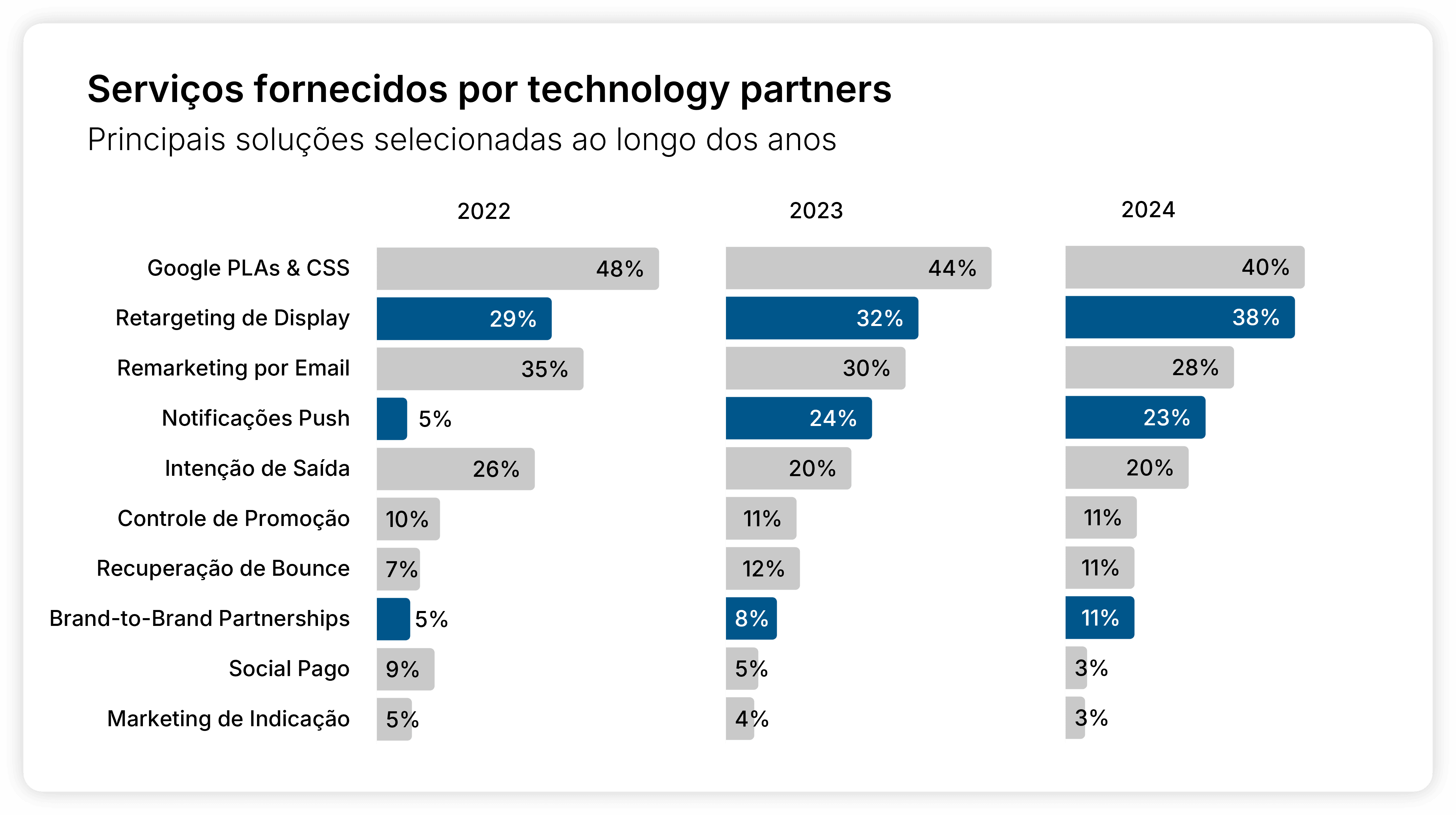 Por exemplo, o redirecionamento de exibição agora é oferecido por 38% dos parceiros de tecnologia, um crescimento de 31% desde 2022. As notificações por push e as parcerias entre marcas também são áreas de alto crescimento, com aumentos registrados de 360% e 120%, respectivamente, no mesmo período.