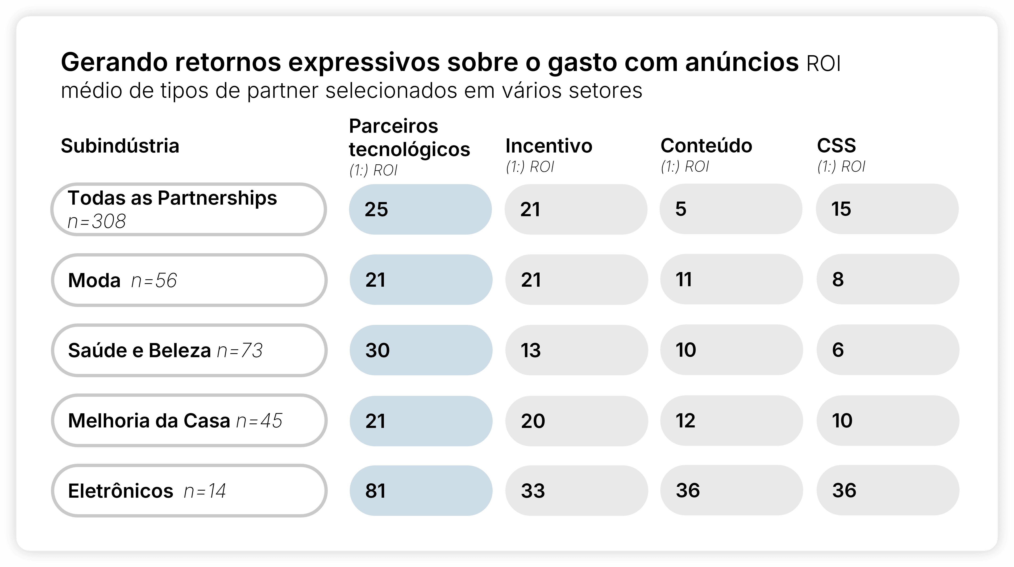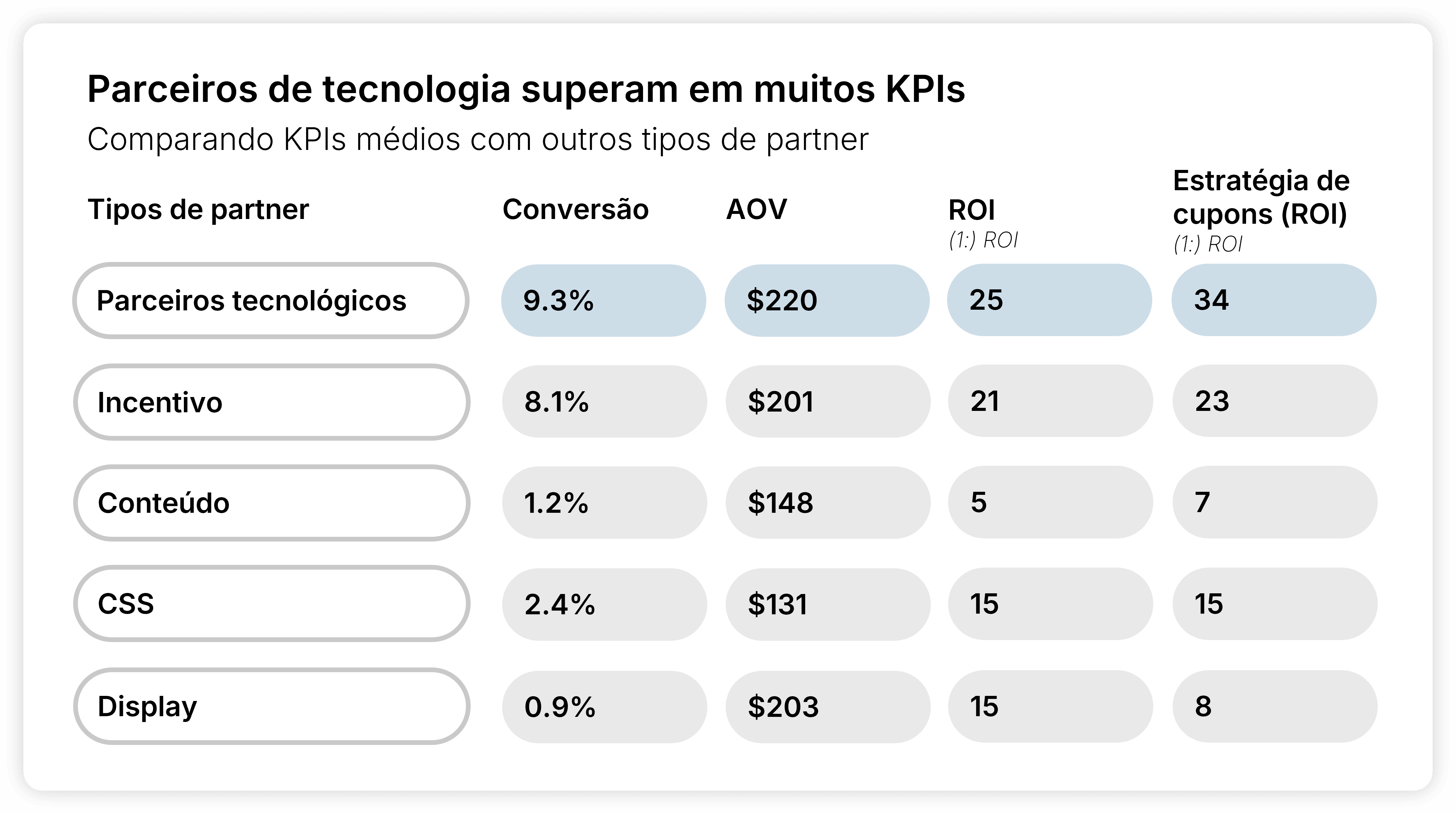 Para concluir, vamos analisar o ROI. A maioria dos parceiros de tecnologia tem lançamento gratuito e tende a operar com base no custo por aquisição (CPA). Essa implementação econômica, combinada com seus resultados, pode explicar por que o retorno sobre o investimento fica em 25:1, acima dos editores de incentivo (21:1), CSS (15:1) e conteúdo (5:1).