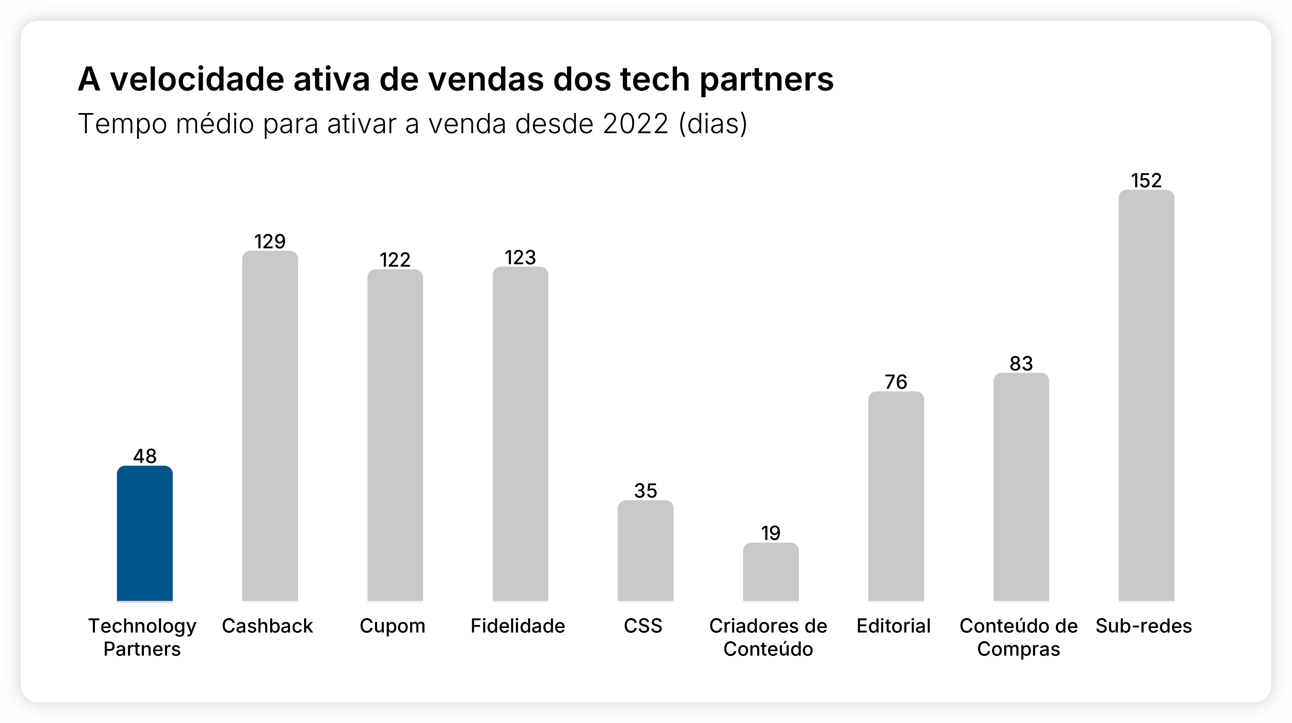 A julgar por dois anos de ativações, são necessários apenas 48 dias para que os parceiros de tecnologia se tornem ativos para venda. Em comparação, cashback, cupons, fidelidade e sub-redes levam mais de 100 dias para atingir o mesmo status.