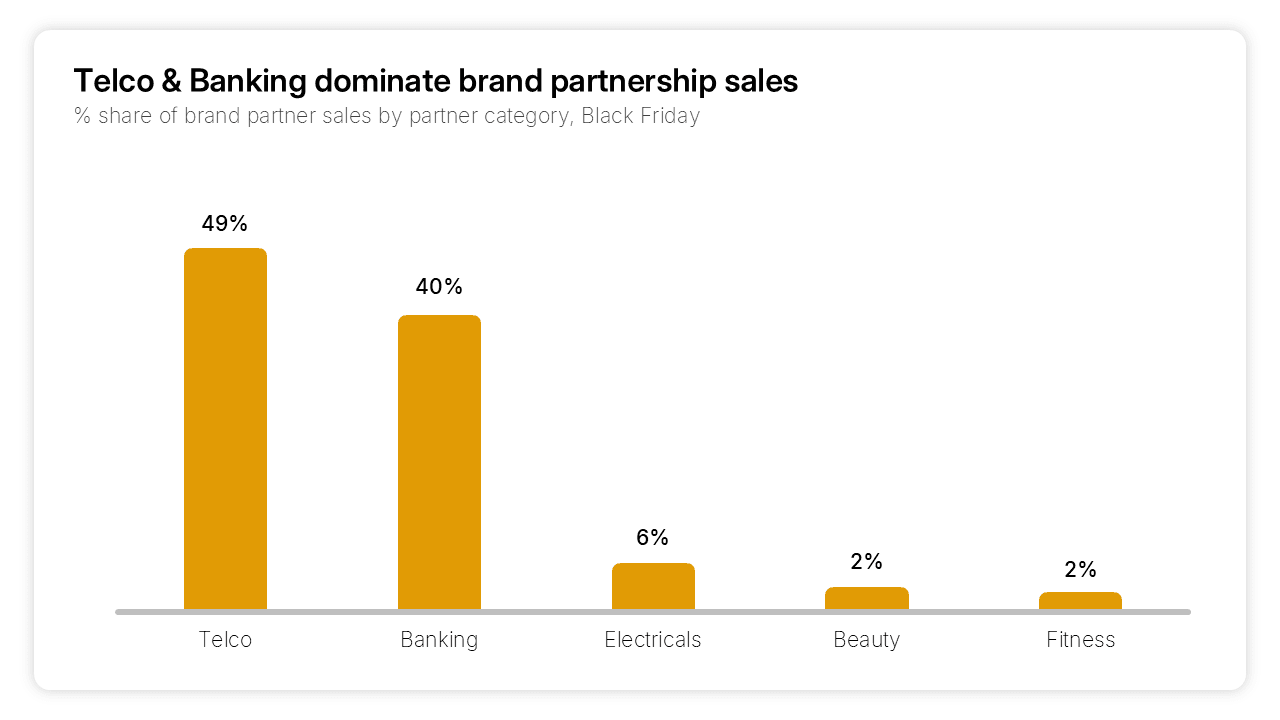 Looking beyond the regional lens and honing in on which sectors are thriving in the brand partnership space, Telecoms and Banking currently dominate the space as promoters of other brands. Combined, the two sectors accounted for almost 90% of brand partnership sales over the Black Friday period with Electricals, Beauty and Fitness bringing up the rear.