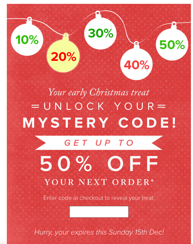 Unique promo codes can be anything you want, and this creates the possibility of turning each promo code into a game of chance. Although we have advised being specific in your coupon title, particularly in emails, creating a sense of mystery can have the same effect for the opposite reason. However, you should be clear in the subject line that a “mystery prize” awaits.