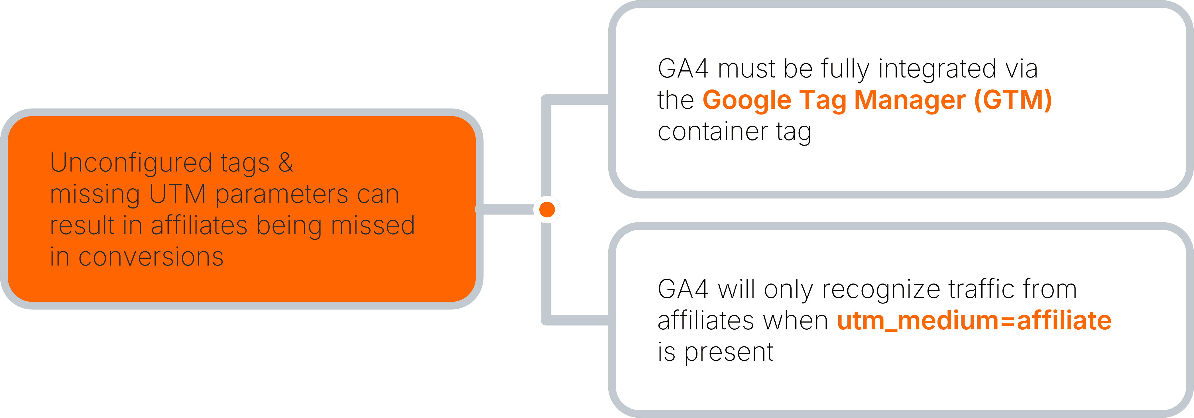 Specifically where affiliate marketing is concerned, GA4 also has a requirement to include the correct UTM parameters in all affiliate traffic. To do this you must ensure that all affiliate clicks contain the parameter utm_medium=affiliate.
