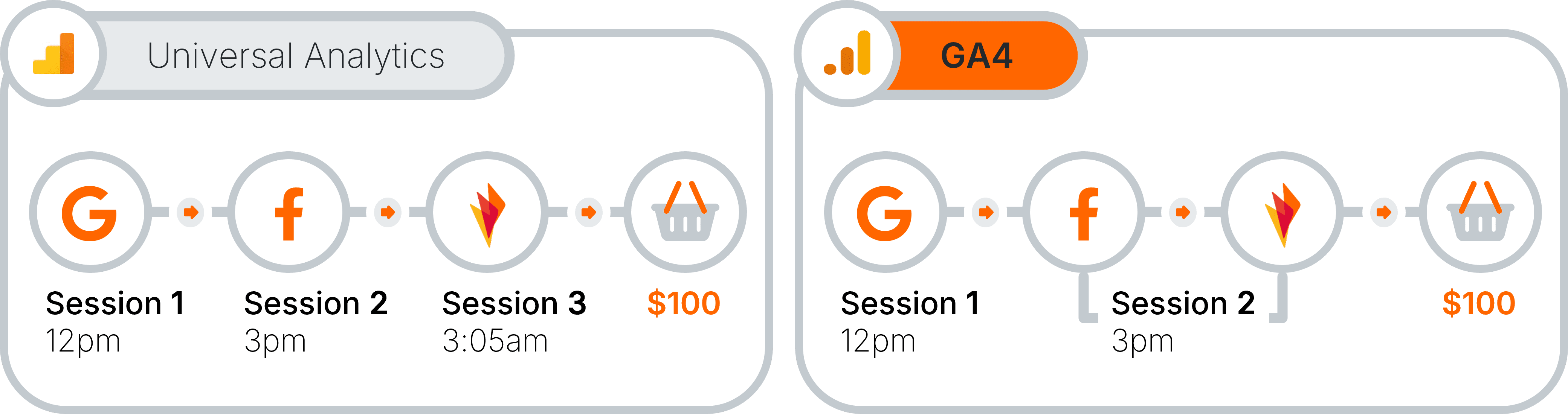 With UA, any time a customer re-entered a website from a distinct marketing channel, this was defined as an event and importantly, a new session. However, with GA4, while this is still considered an event, multiple events can be contained within the same session.