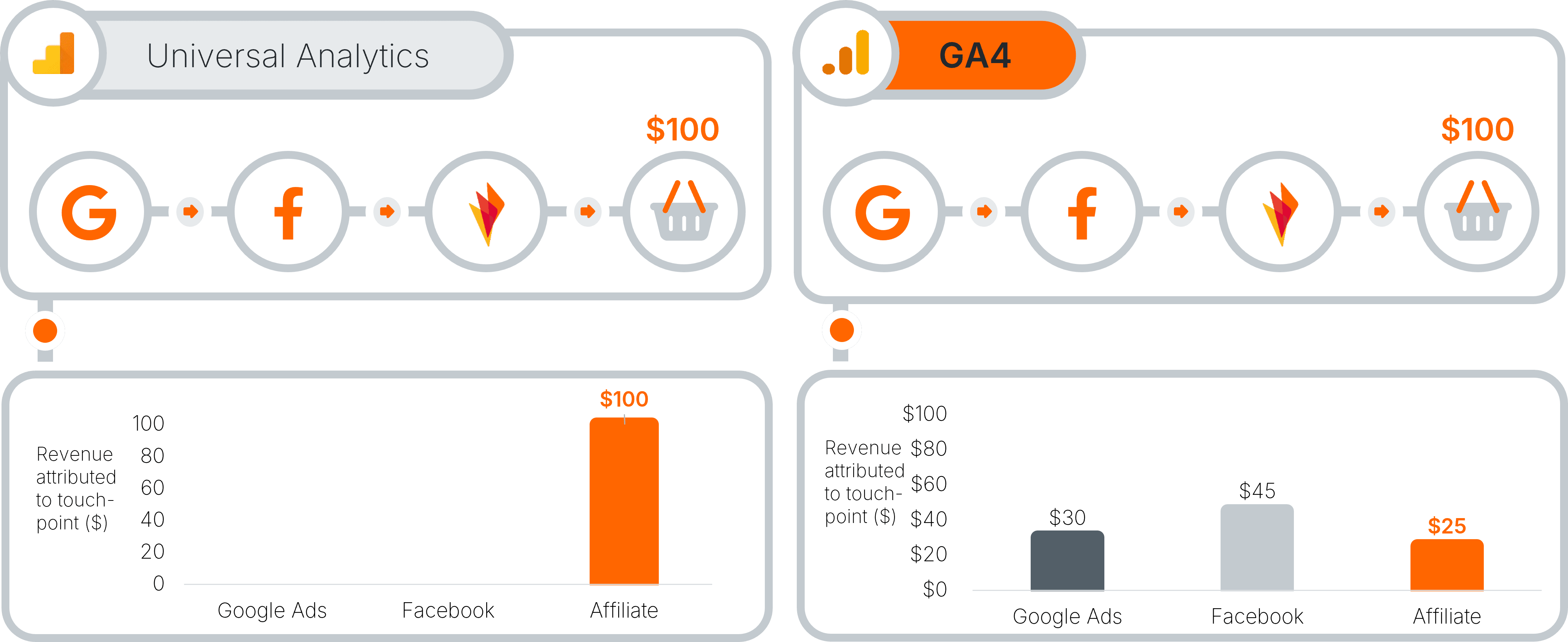 GA4 has changed this model to be a data-driven attribution model by default. This differs considerably from UA in that now all marketing touchpoints involved in the customer journey are credited with a portion of the sale and revenue, with Google’s algorithm determining how much credit is assigned to each respective touchpoint.