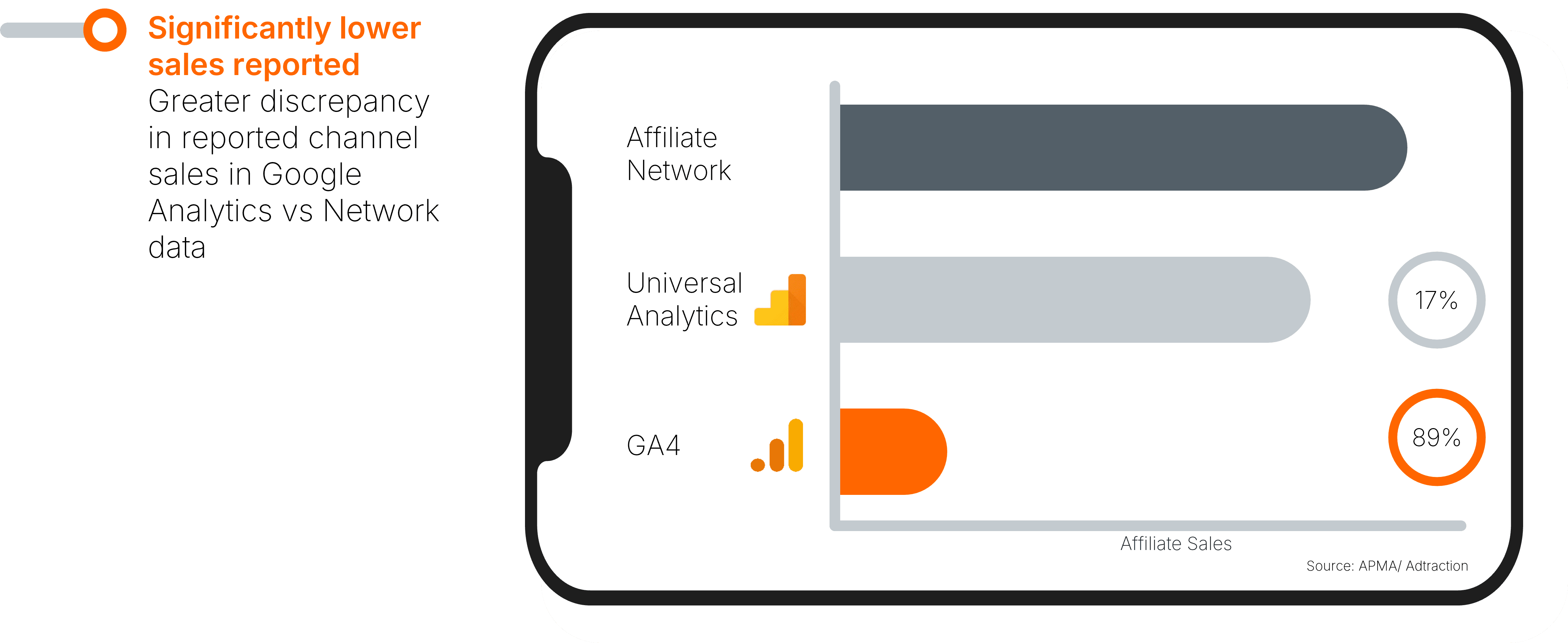 The changes outlined in this article have caused a significant drop in reported performance for the affiliate channel in GA4. Our industry body the APMA, recently published some data from another network, Adtraction which looked at how affiliate performance was reported for the same period across three different reporting tools.