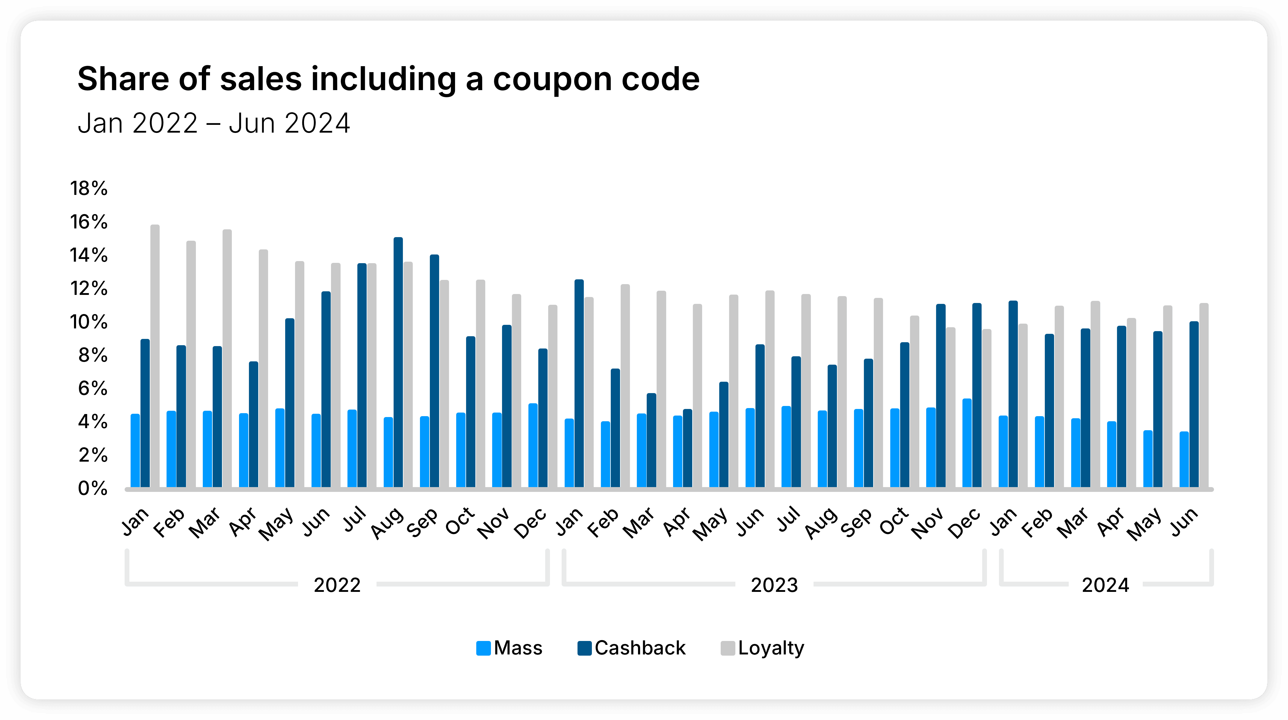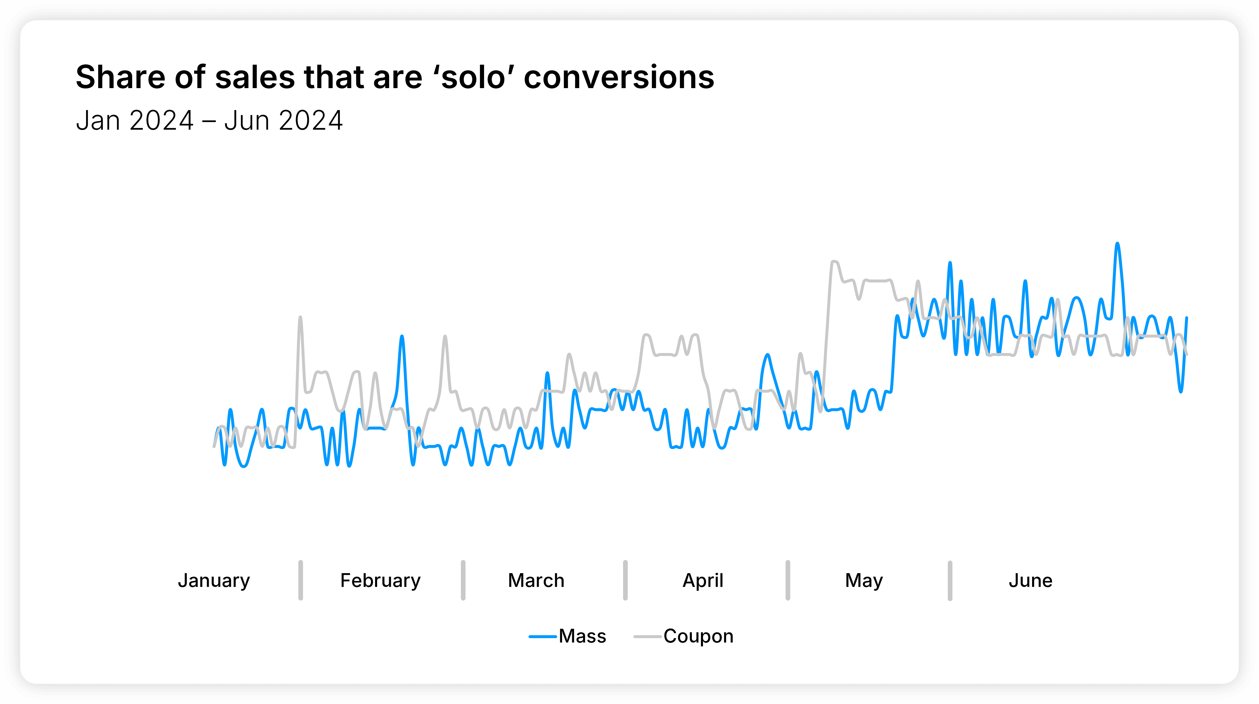One consumer behavior that may have filtered down from the wider ecommerce landscape is discount fatigue. Between January 2022 and June 2024, mass media’s percentage of sales involving a coupon dropped from 25% to 18%. Patently working with less revenue diversification, coupon affiliates went from 40% to 35% in the same period. Seasonality is a factor, though, as we can see from the relatively high percentage of coupon-driven transactions for standard coupon sites between September and December 2023.