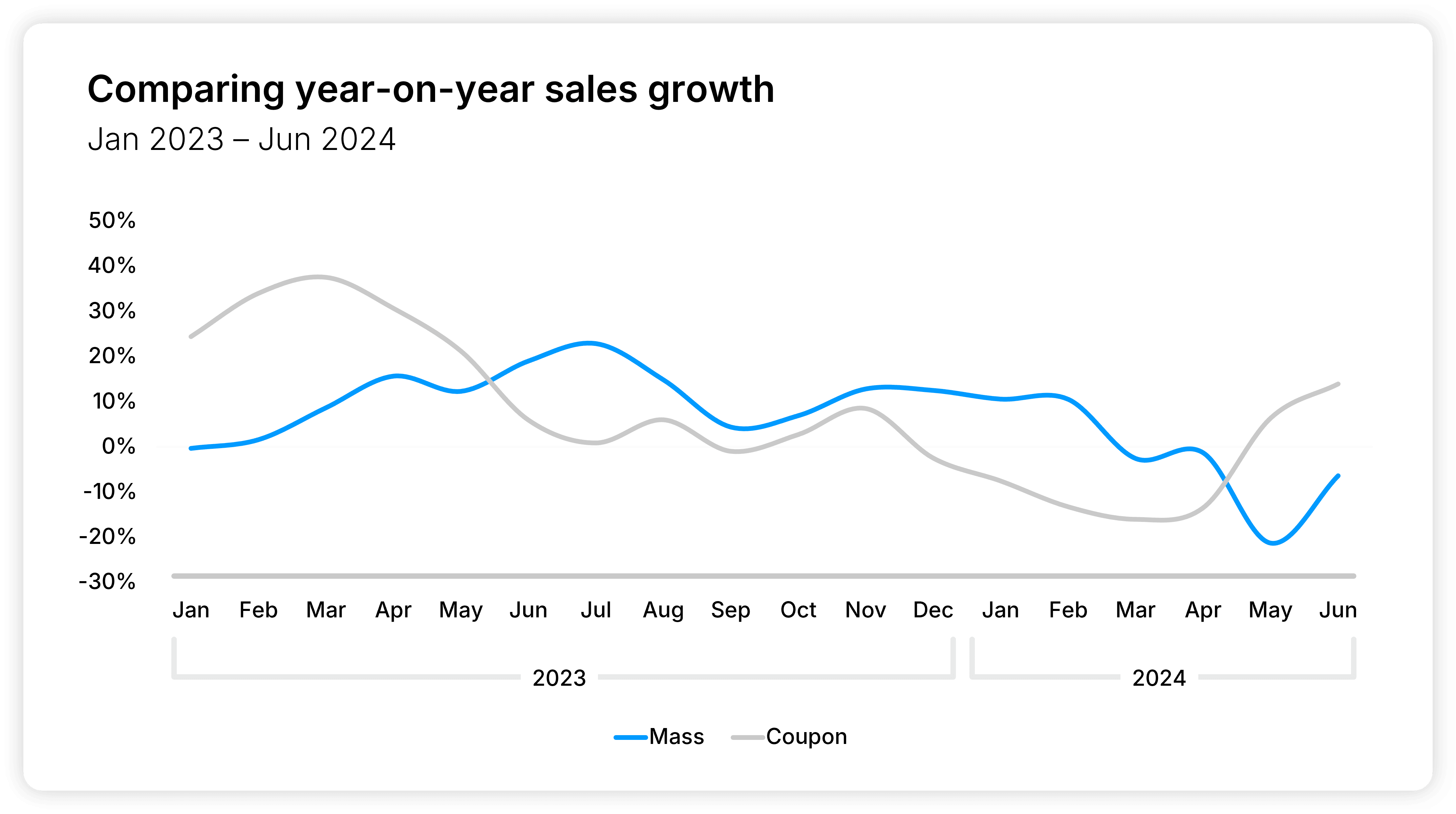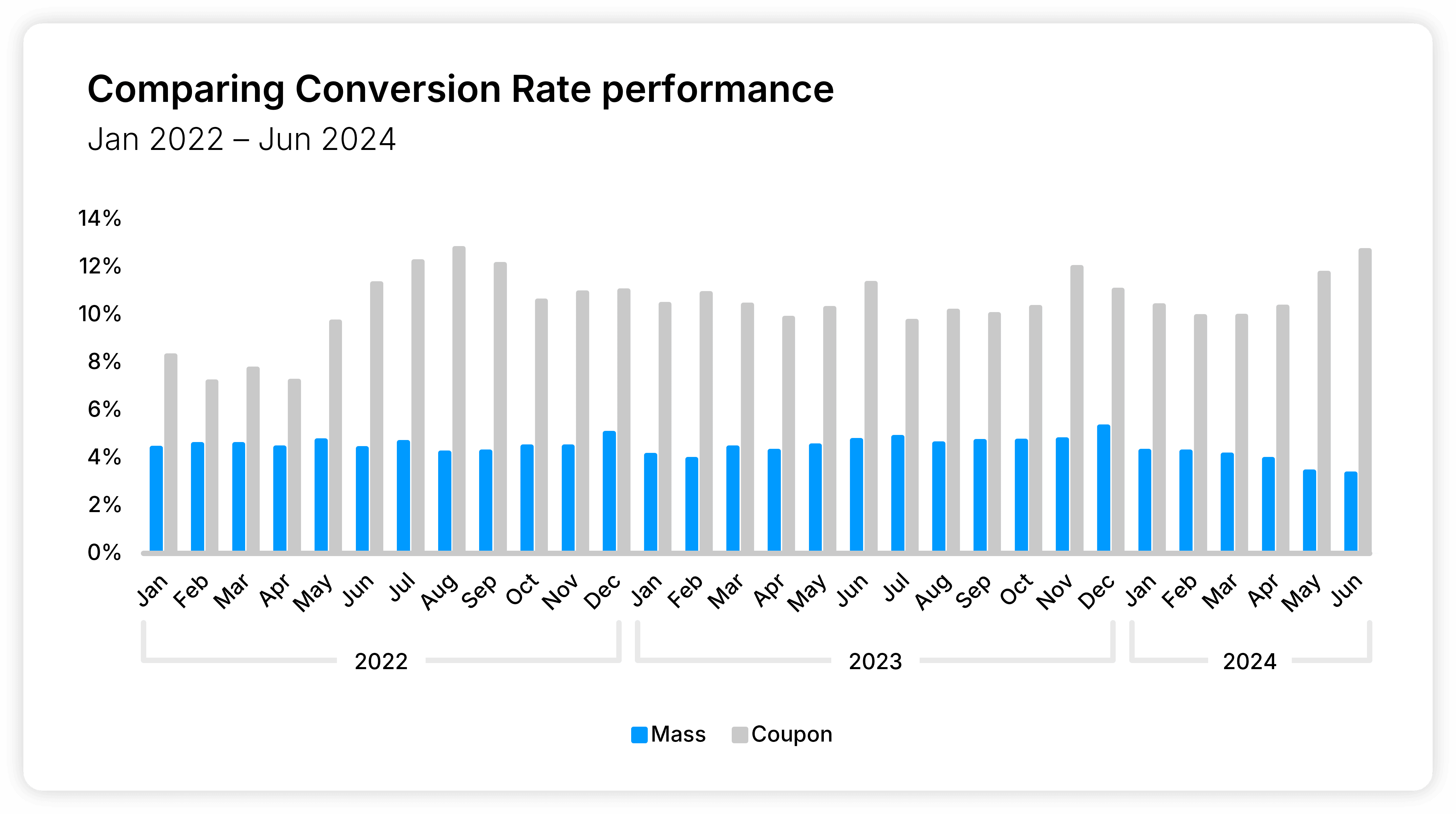 Since April 2022, standard coupon sites have maintained a healthy CVR of 9-12%, far above mass media’s much lower albeit more consistent 3-4% over the same period. The former has even bucked industry-wide declines by increasing its CVR by +53% between January 2022 - June 2024 in the face of a shaky economic climate. Conversely, mass media’s CVR has dropped 25% during the same period.