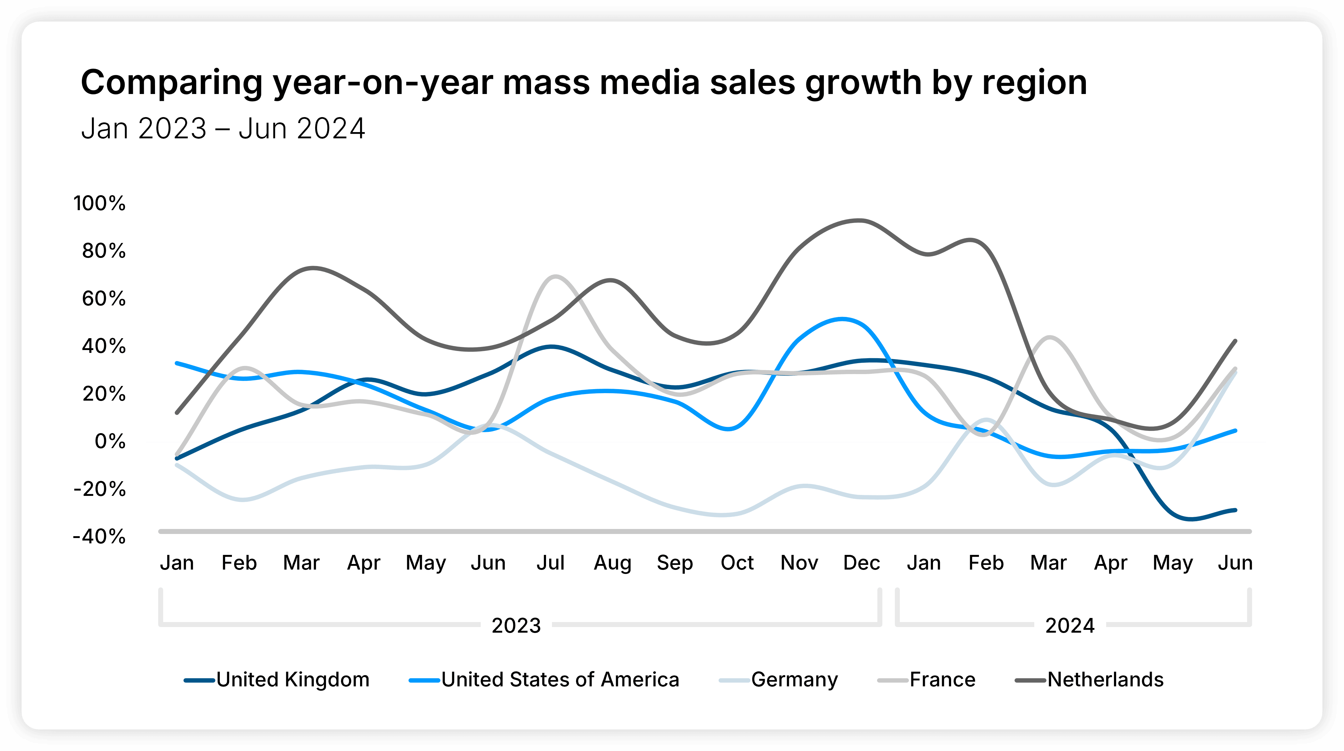 Mass media sites had seen their own decline in sales but at a much slower pace. A strong summer 2023 brought healthy figures in July (+23% YoY), followed by a drop in September (+4% YoY) and then months of stagnation. Sales were down just -1% YoY in April but dropped suddenly to -21% in May after Google’s actions. Sales growth recovered slightly in June, but still represented a decline of -6% on the previous year’s figures.