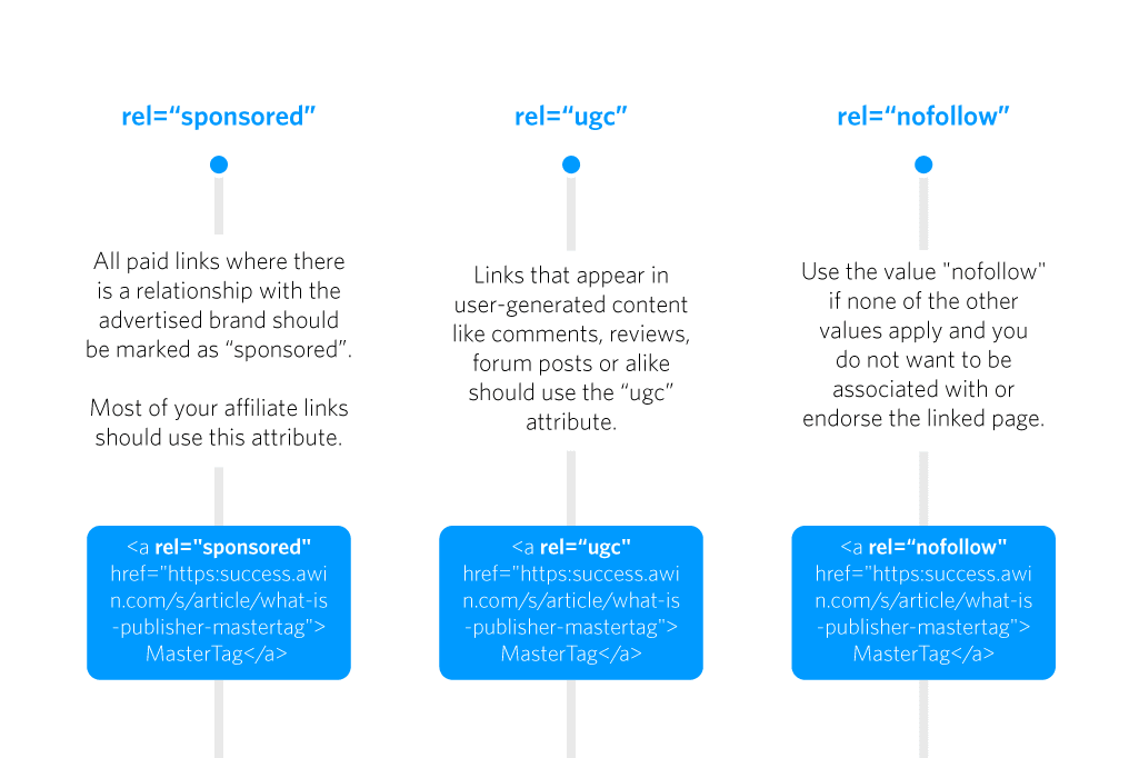 If you work with Awin, most of the links on your website are likely to be affiliate links, so you will need to use the “sponsored” attribute regularly. To ensure your Awin links comply with Google guidelines, our tools automatically add the rel=”sponsored” attribute.