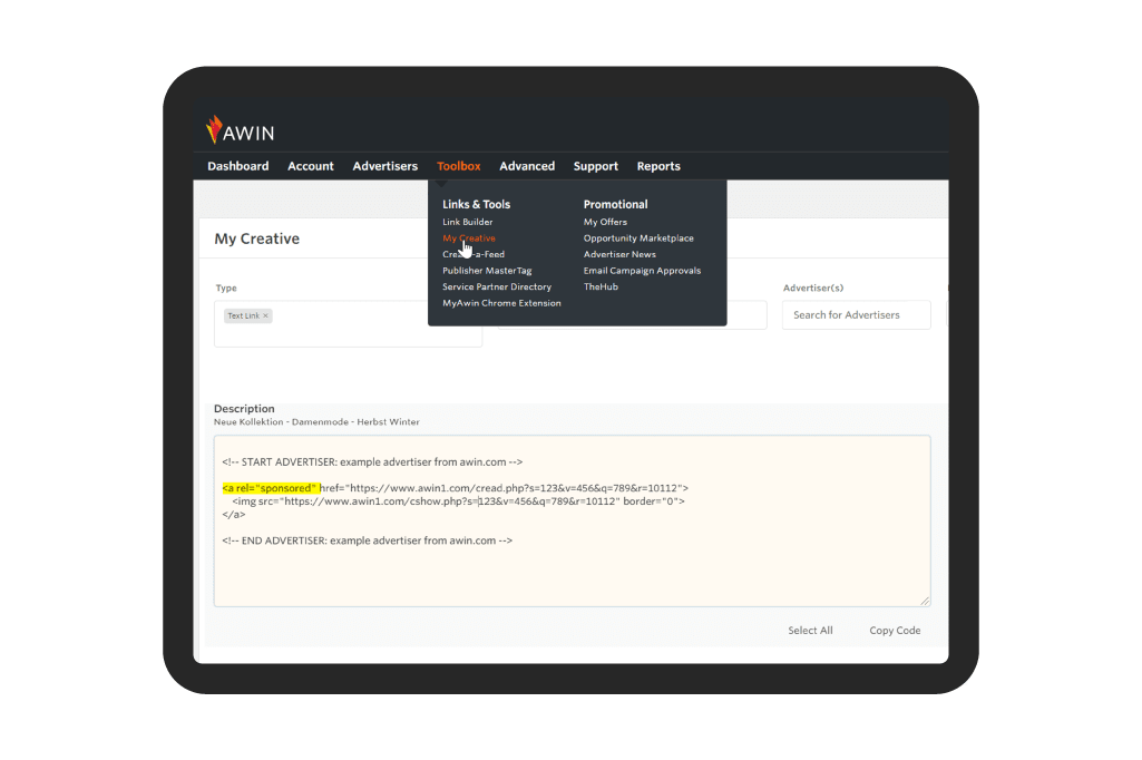 Similar to the Link Builder, the attribute "sponsored" is automatically added to your links and HTML code. The code can then simply be copied and pasted onto your website.