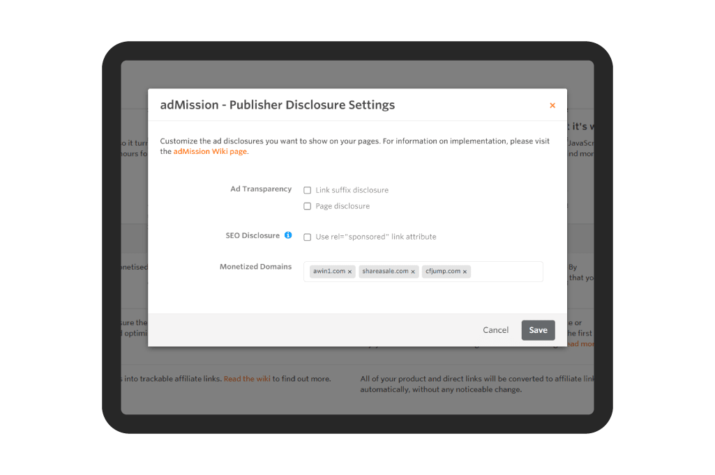 adMission is Awin’s plug-and-play ad disclosure tool for publishers that can easily be activated within the Publisher MasterTag. adMission automatically shows disclosure messages for all your affiliate and commercial traffic and can be used to upgrade existing links that are already on your site.
