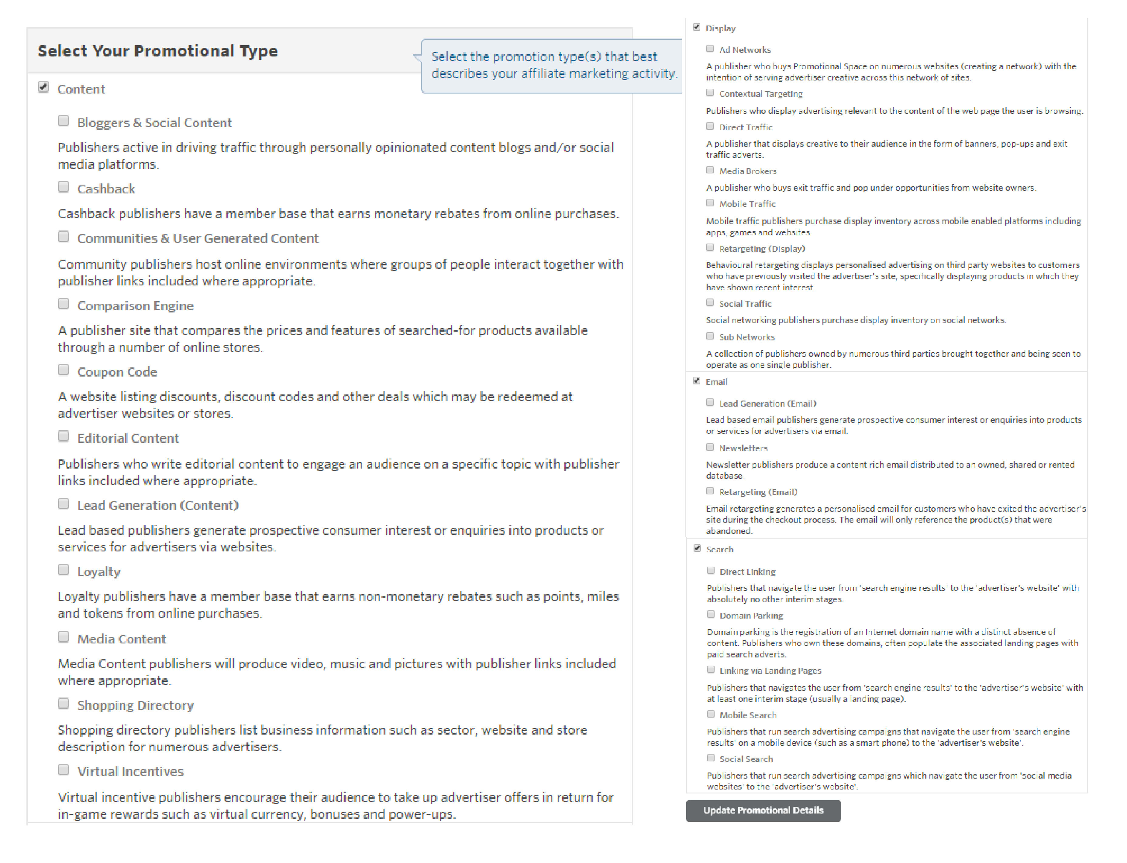 Adding a promotional type is important as it is an easy way for advertisers to identify what promotional methods you use. You may select as many promotional types as are applicable to you, and then set one as your primary promotional type. To add promotional types:
