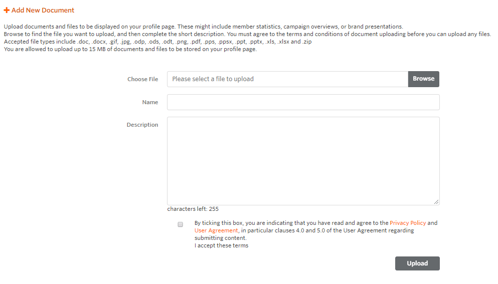 The next tab within your profile is the Documents tab. This is where you will upload any relevant documents like media kits, member statistics, campaign overviews, or brand presentations.