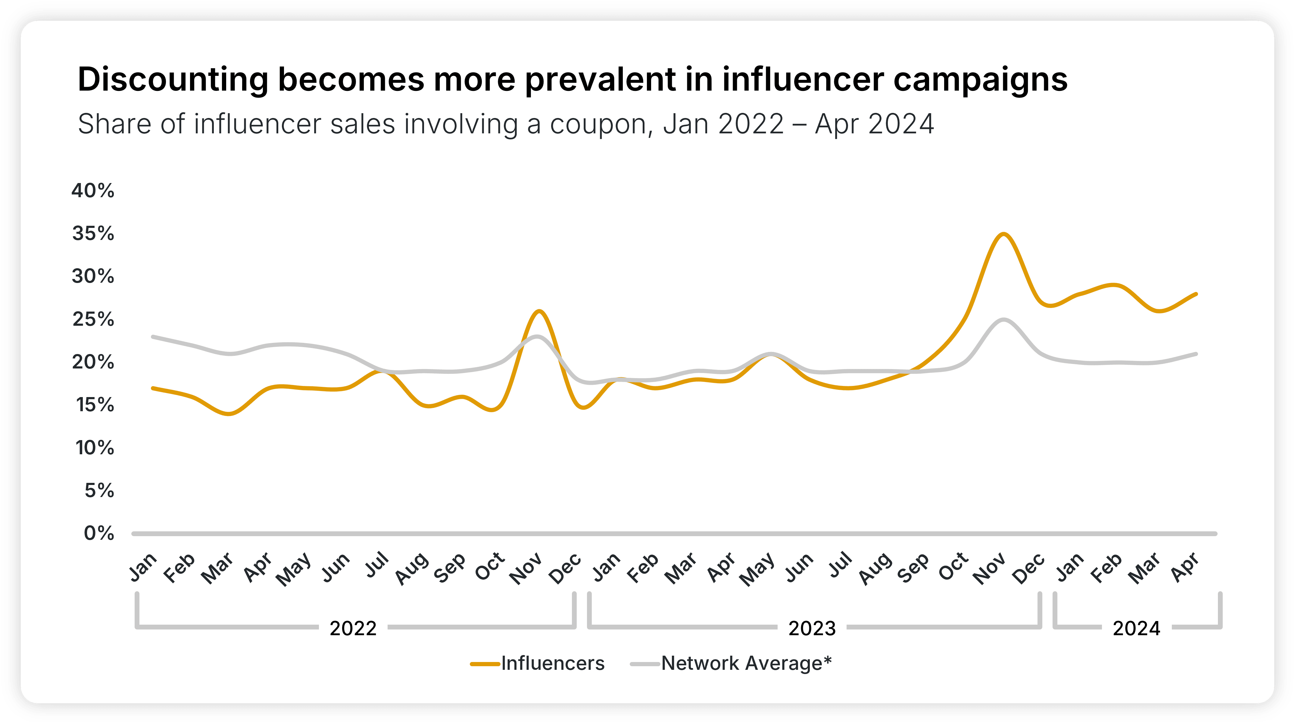 Notably, while the general characterization of influencers and creators is that they tend to operate in more of a brand-building phase of the purchase funnel, the reality is increasingly more nuanced than that. Specifically, it’s worth recognizing the fact that a growing number of sales attributed to influencers involve a coupon code of some sort. And, as the chart below illustrates, that trend is particularly pronounced around Q4 and November. In fact, influencers on Awin’s platform are now generating sales involving a coupon much more frequently than the platform average for other partner types.
