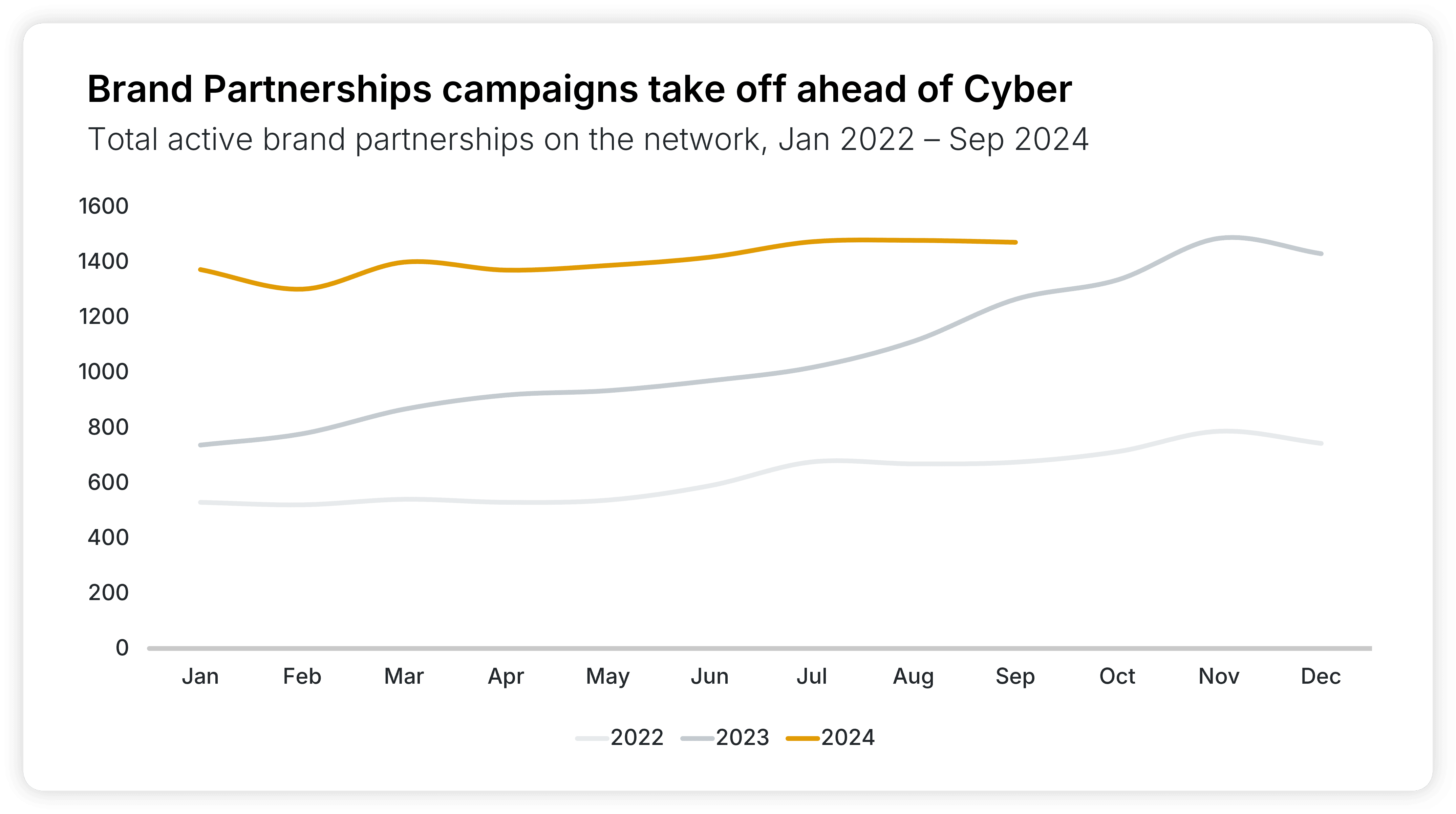 As pressure mounts on advertisers to find new revenue streams come Q4, we expect an uptick in brand partnership campaigns as advertisers search for like-minded brands to mutually benefit from. In the previous two years, we’ve seen active brand partnerships increase in Q4, with 2023 seeing a particularly strong increase. Alongside a much greater number of brand partnerships throughout the year, we expect to see a similar uptick in brand partnerships as Black Friday approaches.