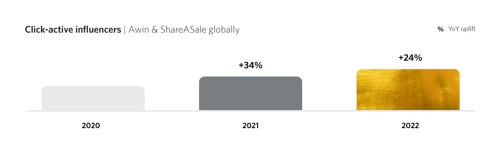 In line with the booming influencer marketing industry, the Awin Group has seen the number of click-active influencers grow on our platforms globally in recent years with a 24% YoY uplift from 2021 to 2022, and a 34% YoY increase from 2020 to 2021.