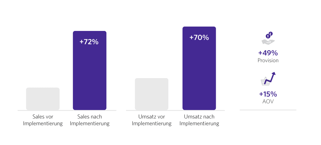 Diese Erfolgsbeispiele geben einen noch besseren Einblick in die Relevanz von App-Tracking: Ein Advertiser, der App-Tracking im ersten Halbjahr 2021 implementierte, verzeichnete schon zwei Monate später enorme Steigerungen bei allen KPIs. Dabei erzielten die Umsätze und Sales einen Uplift von über 70%. Besonders spannend ist hierbei, dass die Performance außerhalb der App nicht nachließ, sondern parallel zu den getrackten App-Events zunahm. Bei einem anderen Advertiser stiegen die Sales um über 150%. Und das nur einen Monat nach der Implementierung. Fast 50% davon waren allein auf InApp-Sales zurückzuführen.