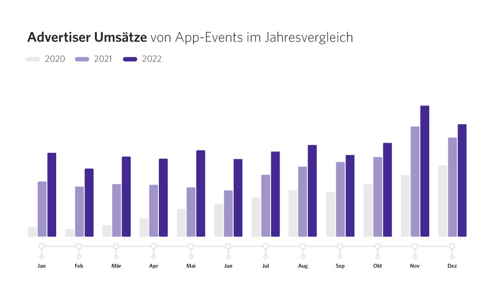 Angesichts der ständigen Sorge um weitere Tracking-Einschränkungen durch Datenschutzgesetze treffen Unternehmen Investitionsentscheidungen in der digitalen Welt immer vorsichtiger und zurückhaltender. Spätestens zum Jahresende 2022 ist jedoch klar, dass App-Tracking ein wertvolles und wichtiges Instrument für Publisher und Advertiser gleichermaßen ist. Denn wir verzeichneten über 14 Millionen (+19% YoY) In-App Sales für unsere Advertiser und 31 Millionen Euro an Publisher-Provisionen (+55% YoY).
