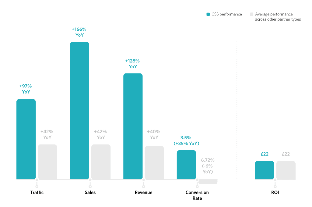 Die wachsende Popularität von CSS war eine der markantesten Erfolgsgeschichten im Affiliate Marketing der letzten Jahre und hat vor allem im Jahr 2020 nochmals erheblich an Bedeutung gewonnen. Ein Vergleich des Wachstums der CSS-Partner mit dem Wachstum anderer Publisher Verticals in diesem Jahr verdeutlicht dies.