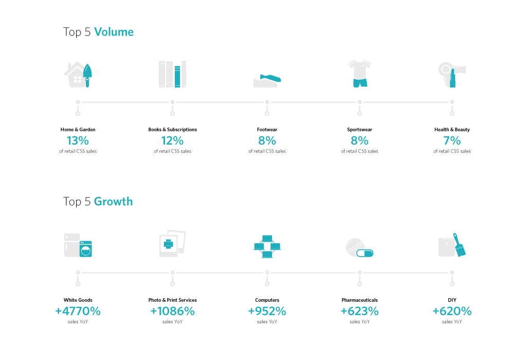 Nachfolgend sind zum einen die fünf wichtigsten Sub-Industrien des Einzelhandels abgebildet, die derzeit den größten Anteil am CSS-Umsatz ausmachen und zum anderen die, die im Jahr 2020 das schnellste Wachstum verzeichnet haben: